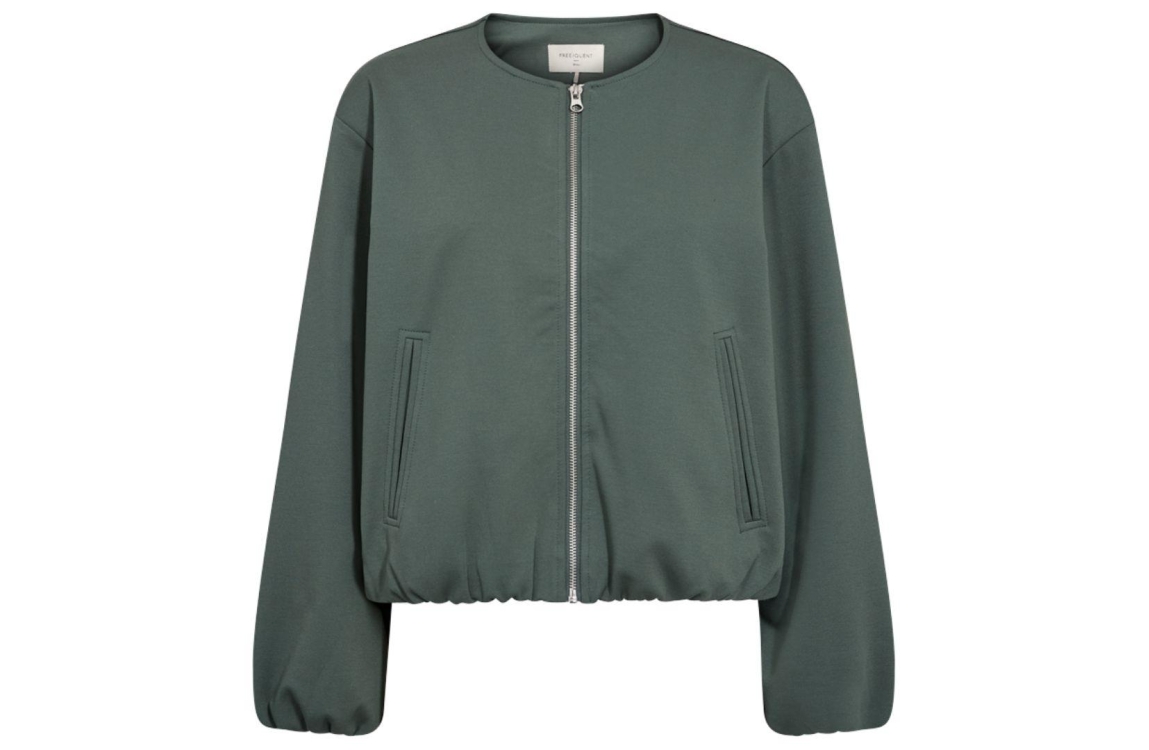 Freequent jasje 207321. Dit bomber model heeft een ronde halslijn en lange mouwen. Het donkergroene jasje van Freequent sluit aan de voorzijde door middel van een ritssluiting en is voorzien van twee steekzakken. Het model is afgewerkt met elastische boorden.