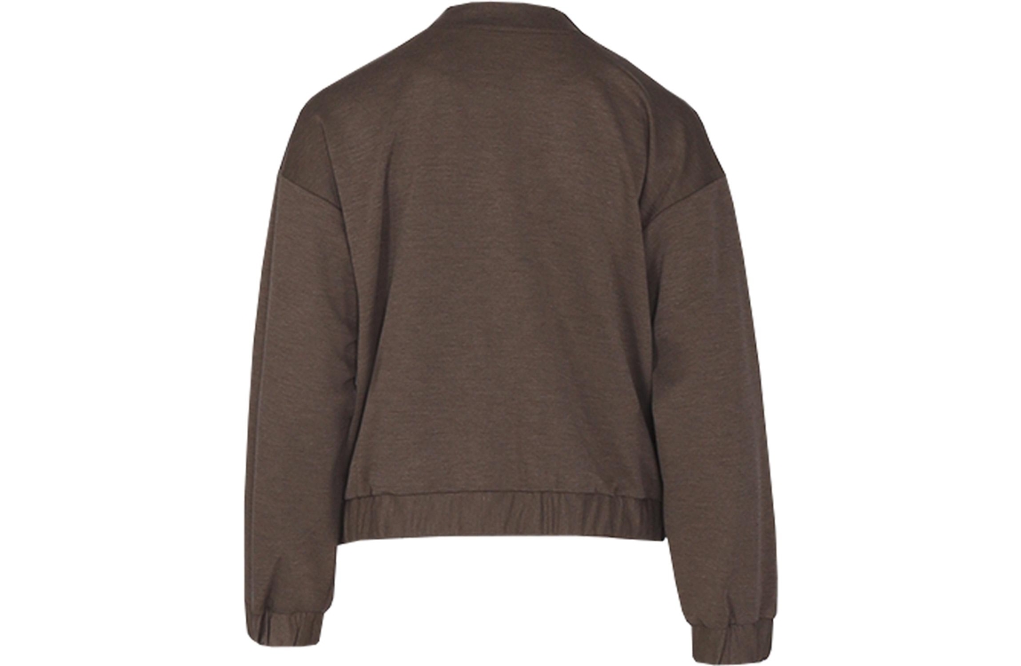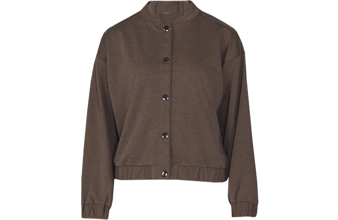 Freequent jacket FQNAYA 206027. Dit wijdvallend model is voorzien van een ronde hals en heeft lange mouwen. Deze bruine jacket van Freequent sluit door middel van drukknopen en beschikt over twee steekzakken. Dit model is afgewerkt met elastische boorden.