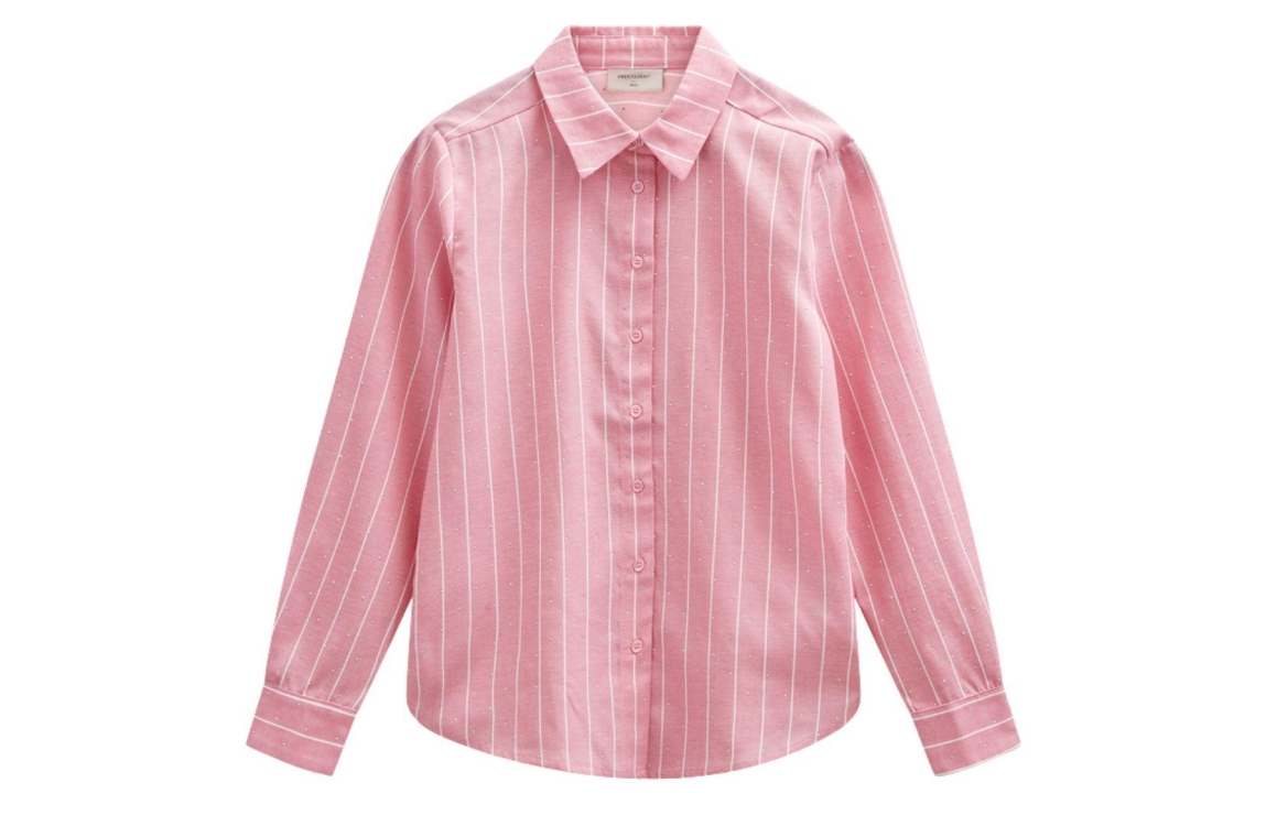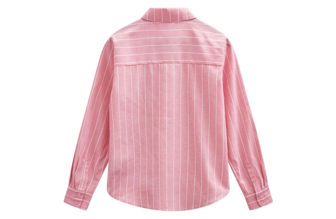 Freequent blouse 207427. Dit rechtvallende model heeft een kraag en lange mouwen. Deze roze blouse van Freequent is uitgevoerd in een streepprint en is all-over bewerkt met strass-steentjes. Het model sluit aan de voorzijde door middel van knopen en is afgewerkt met manchetten.