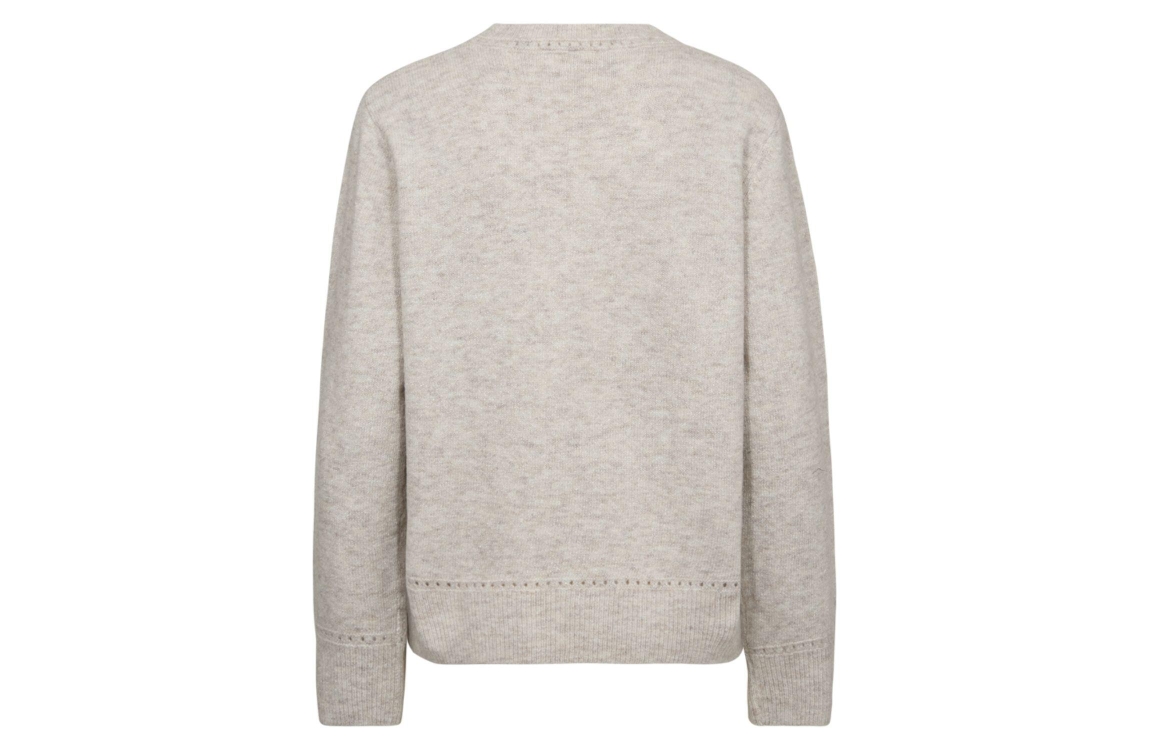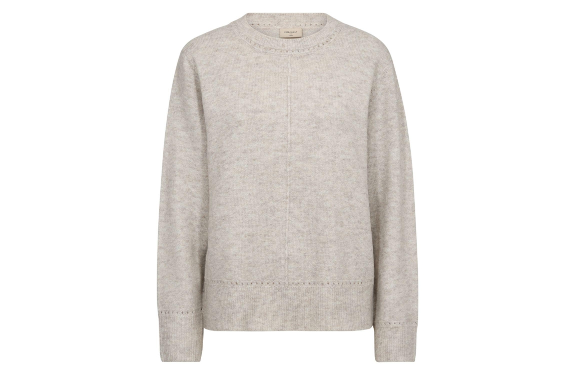 Freequent Hole details end metallic Moonbeam w.silver. Dit rechtvallende model is voorzien van een ronde hals en lange mouwen. Deze beige pullover van Freequent is gemaakt van een fijngebreide stof met een glanzende uitstraling en is op de mouwen bewerkt met ribdetails. Dit model is afgewerkt met brede ribboorden.