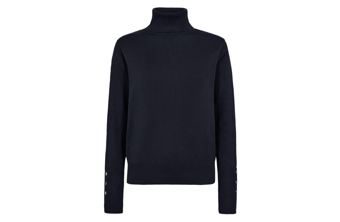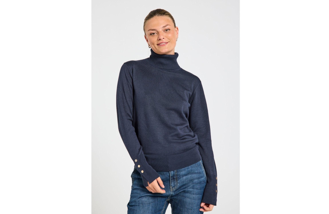 Freequent Plain flat gold button Salute. Dit rechtvallende model is voorzien van een col en heeft lange mouwen. Deze navy pullover van Freequent is bewerkt met sierlijke knopen onderaan de mouwen.
