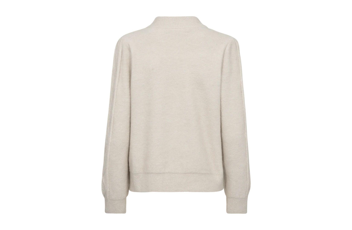 Freequent Pullover Moonbeam w.black. Dit rechtvallende model is voorzien van een ronde hals en heeft lange mouwen. Deze beige trui van Freequent is bewerkt met een contrasterend kabelbreisel aan de voorzijde. Dit model is afgewerkt met ribboorden.
