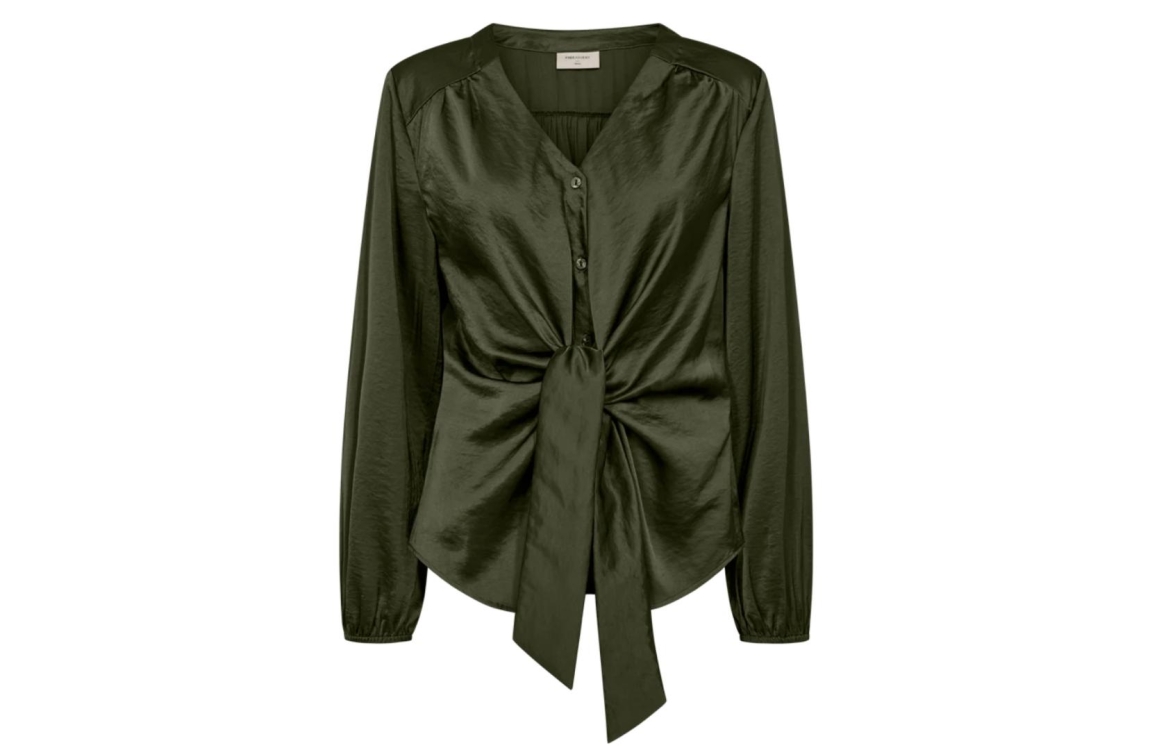 Freequent Sateen blouse 207579 FQDOVE. Het soepelvallend model heeft een v-hals en lange mouwen. Deze groene blouse van Freequent is bewerkt met een strik op het voorpand en sluit door middel van knopen.