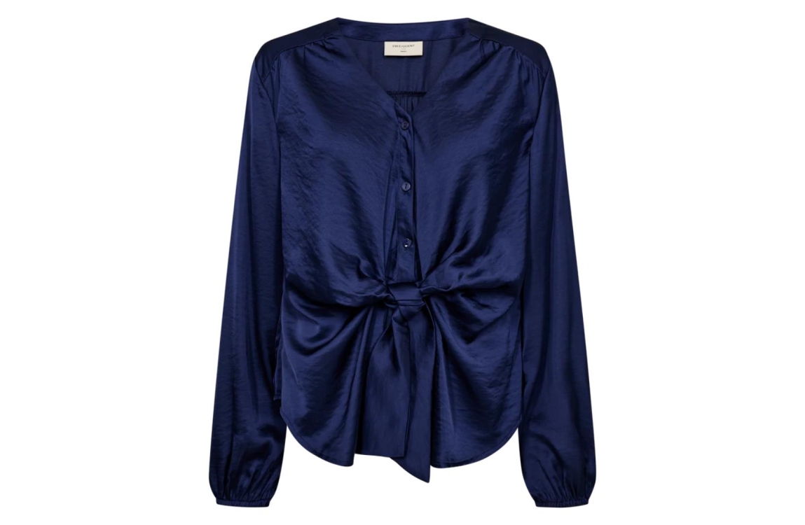 Freequent Sateen blouse 207579 FQDOVE. Het soepelvallend model heeft een v-hals en lange mouwen. Deze blauwe blouse van Freequent is bewerkt met een strik op het voorpand en sluit door middel van knopen.