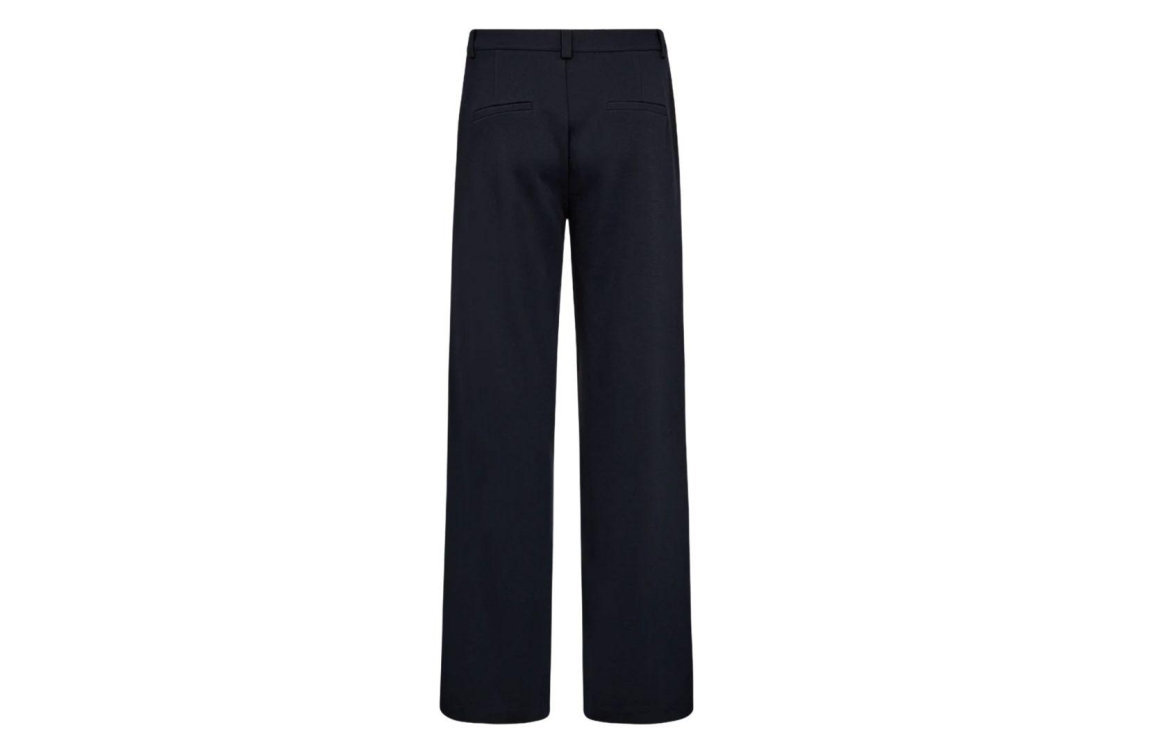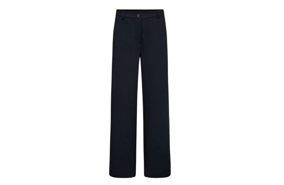 Freequent broek 200632 FQNanni. Dit wide leg model sluit aan de voorzijde door middel van een knoop en rits. Deze donkerblauwe broek van Freequent is aan de voorzijde voorzien van twee schuine steekzakken en aan de achterzijde voorzien van twee decoratieve paspelzakken.