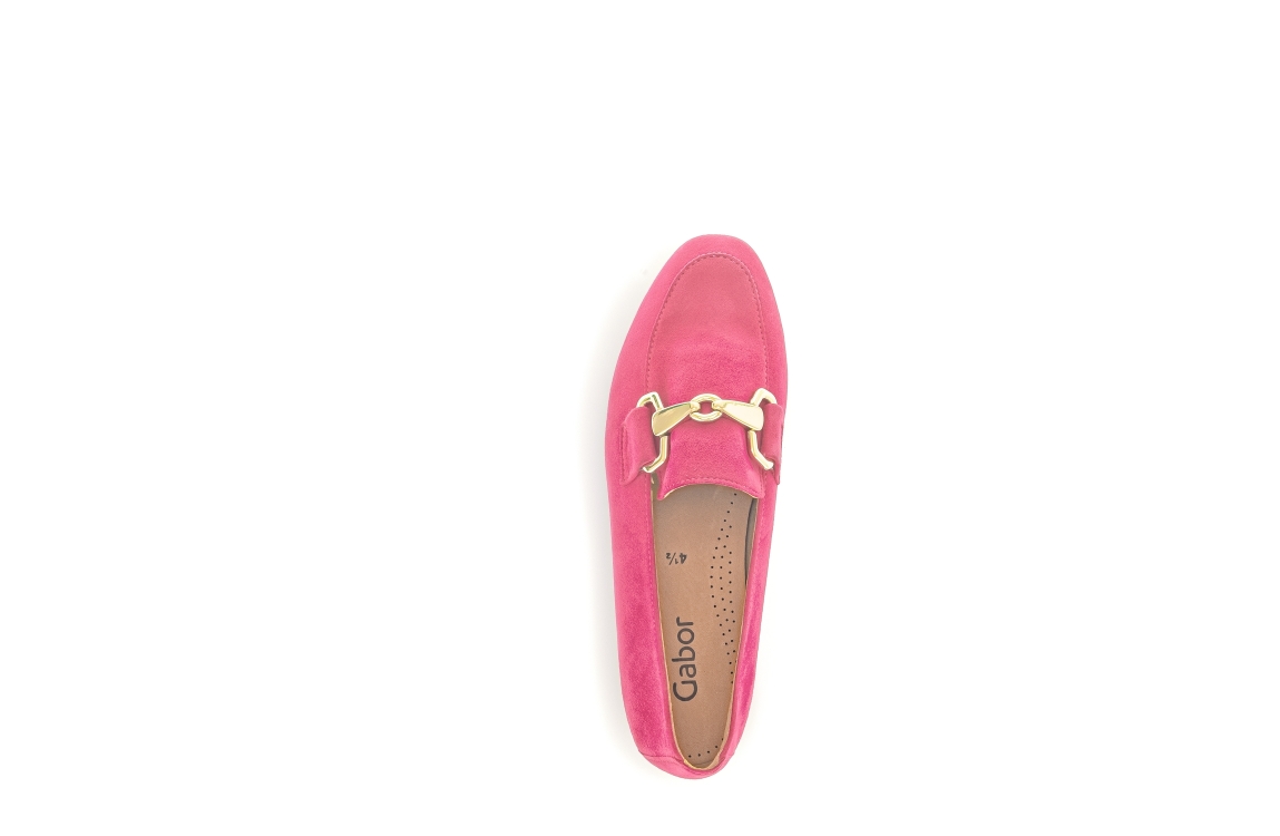 Gabor instapper 45.211.34. Dit roze suede model is bewerkt met een goudkleurige gesp op de wreef en beschikt over een zwarte zool.
