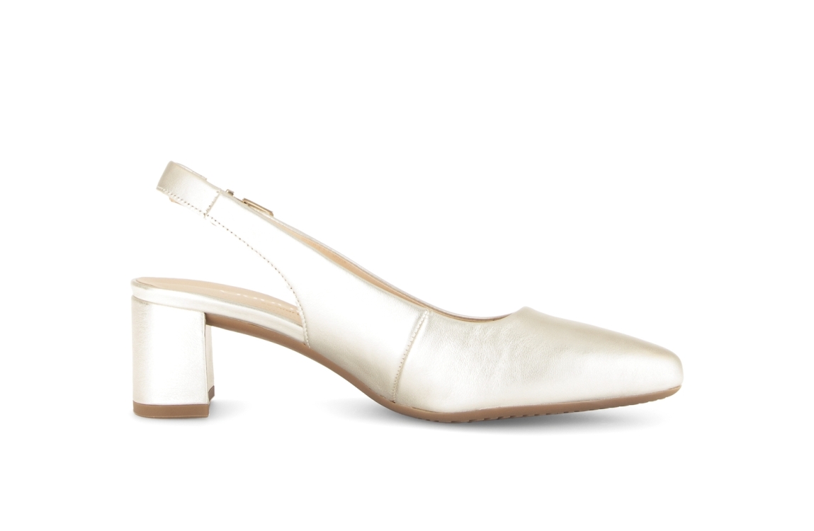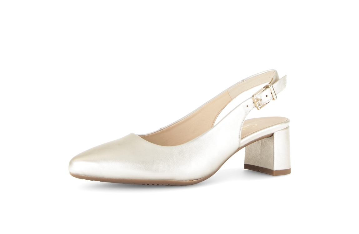 Gabor pumps 82.260.81. Dit instapmodel is voorzien van een puntige neus. Deze goudkleurige pump van Gabor is bewerkt met een beklede hak van 5 cm en sluit door middel van een gesp. Dit model heeft een open hiel.