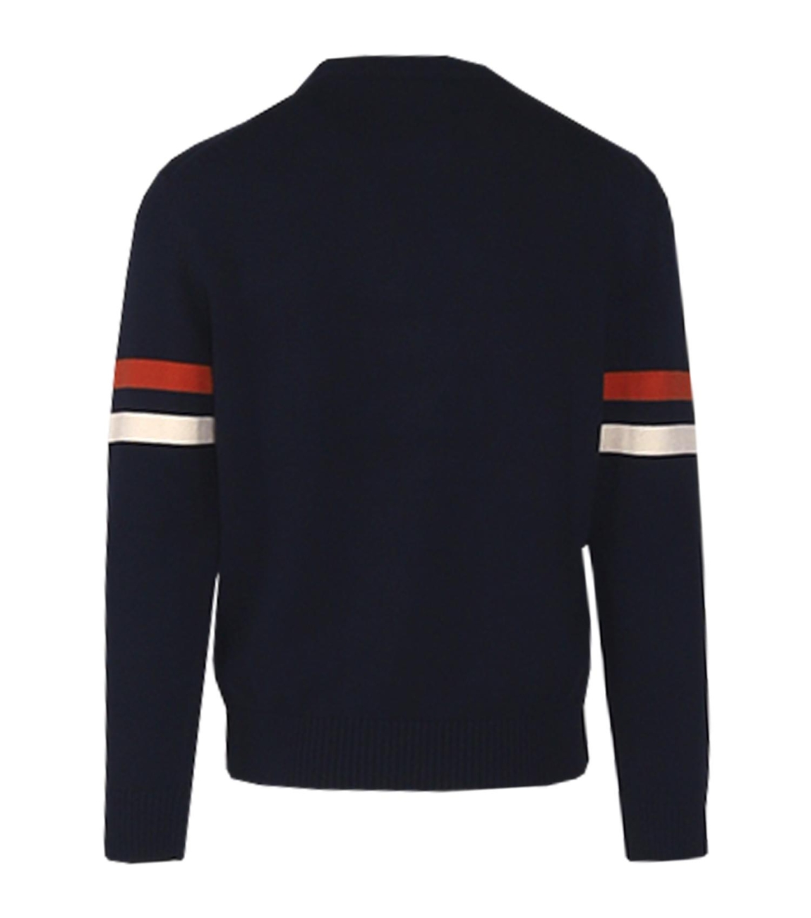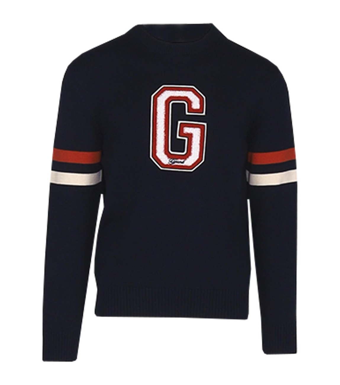 Gant trui 8030264-433. Dit rechtvallend model is voorzien van een ronde hals en heeft lange mouwen. Deze donkerblauwe trui van Gant is bewerkt met een grote badge aan de voorzijde en is afgewerkt met oranje en witte strepen op de mouwen.