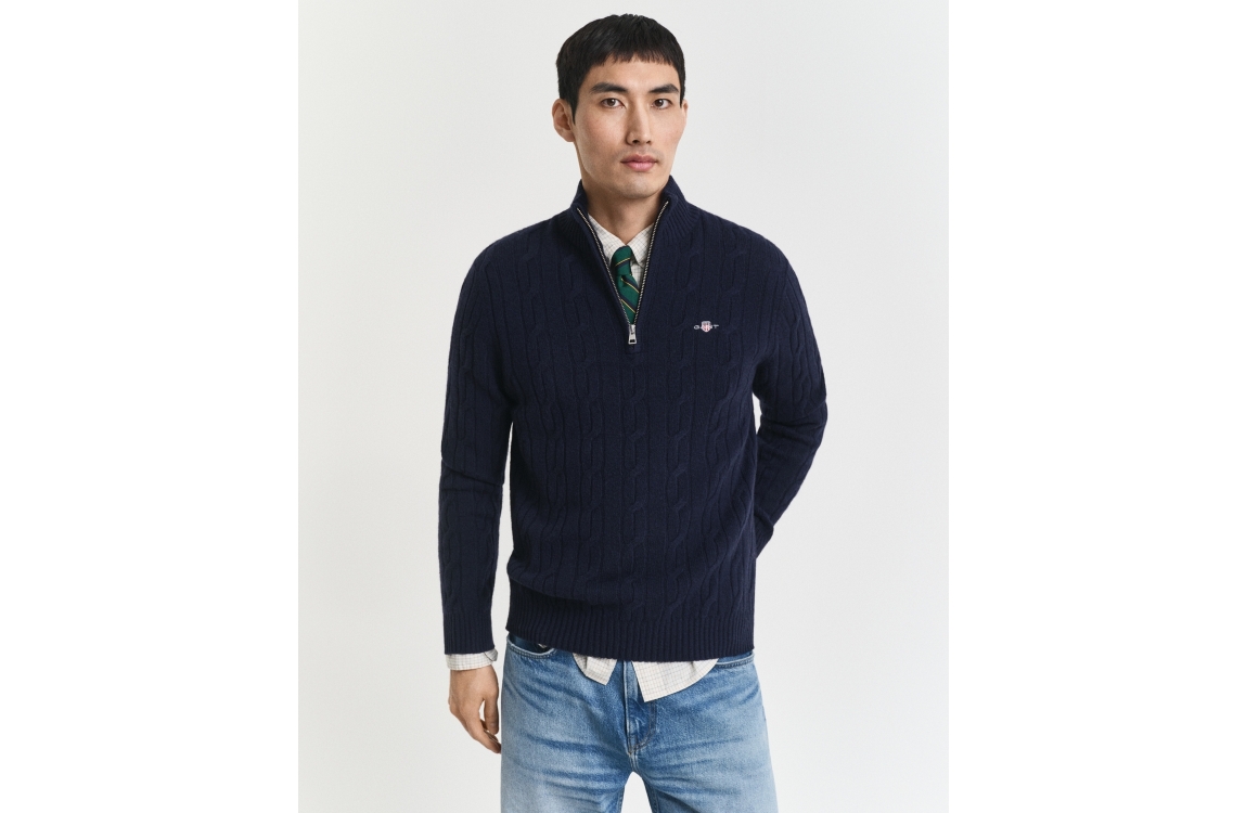 Gant sweater 8050260-433. Dit rechtvallend model is voorzien van een turtle neck met rits en heeft lange mouwen. Deze donkerblauwe trui van Gant is bewerkt met merkembleem en is uitgevoerd met een kabelstructuur.