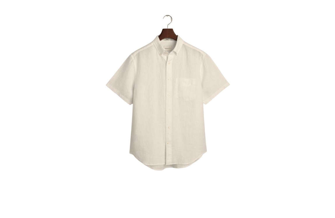 Gant shirt 3250077. Dit rechtvallend model is voorzien van een kraag en heeft korte mouwen. Deze beige linnen shirt van Gant sluit door middel van knopen en is afgewerkt met een borstzak met logo aan de linkerzijde.