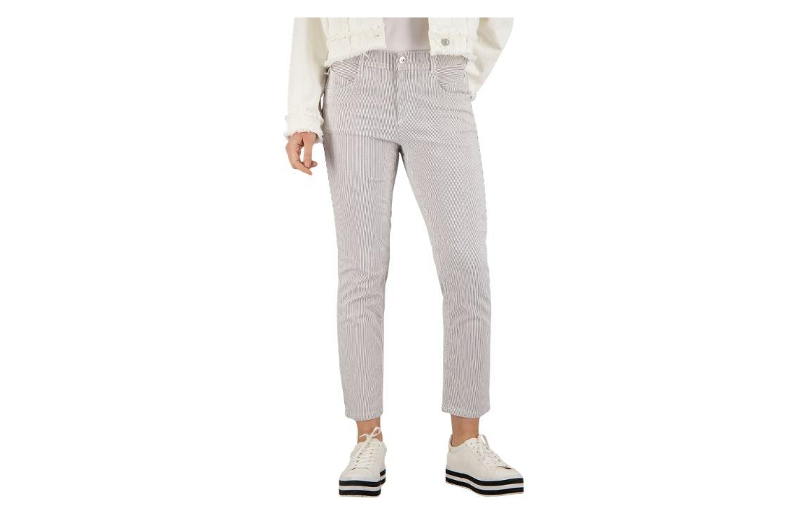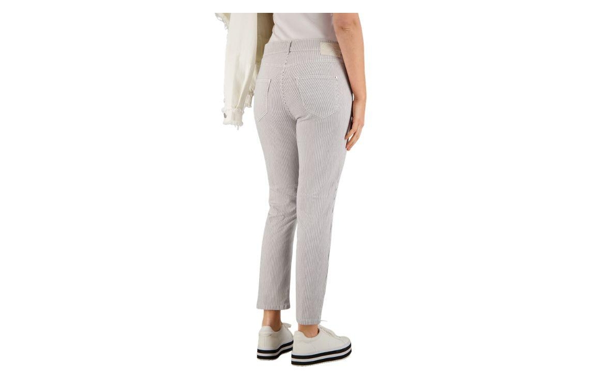 Gardeur broek ZURI128 621951 1068. Dit slim fit model sluit door middel van een knoop- en ritssluiting en is voorzien van ceintuurlussen. Deze donkerblauwe broek van Gardeur is all-over bewerkt met een streepprint en is uitgevoerd in een 5-pocket model.