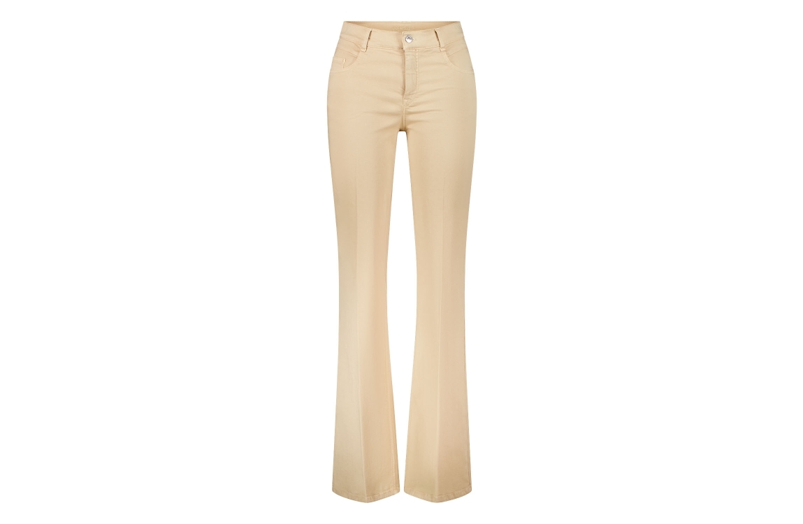 Gardeur broek ZURI126 80731 2014. Dit flared fit model sluit door middel van een knoop- en ritszakken en is voorzien van ceintuurlussen. Deze zandkleurige broek van Gardeur is uitgevoerd in een 5-pocket model en is voorzien van een plooidetail over de lengte van de been.