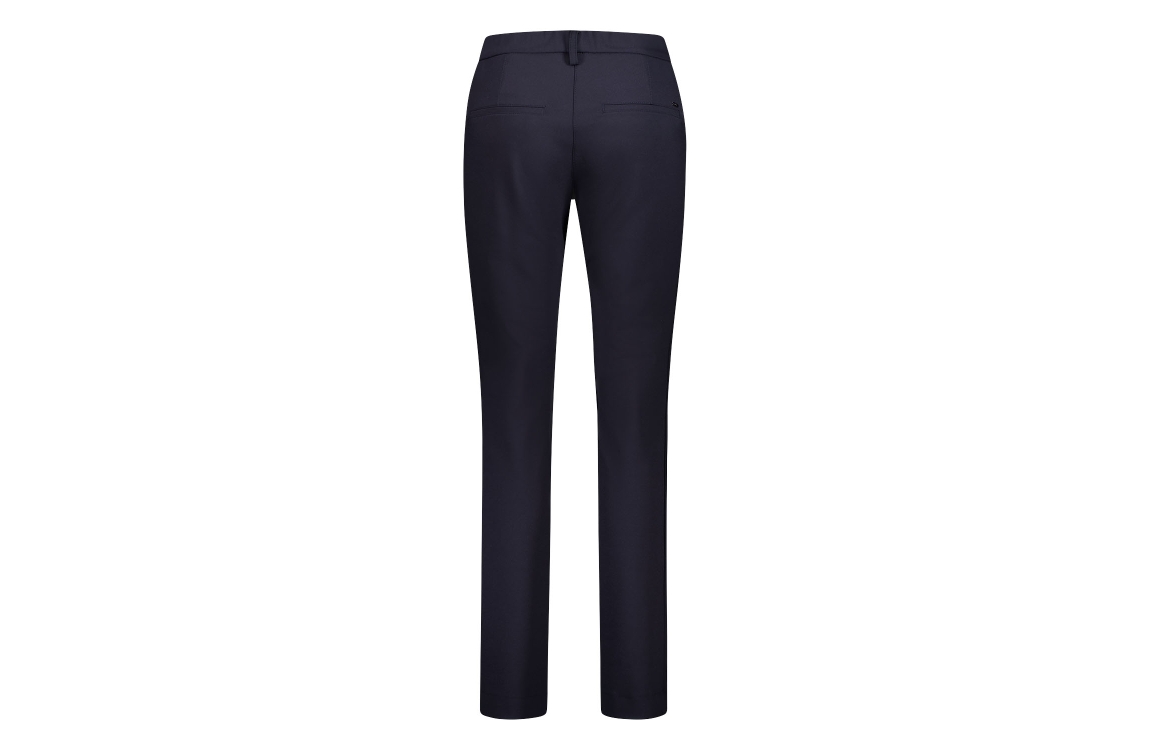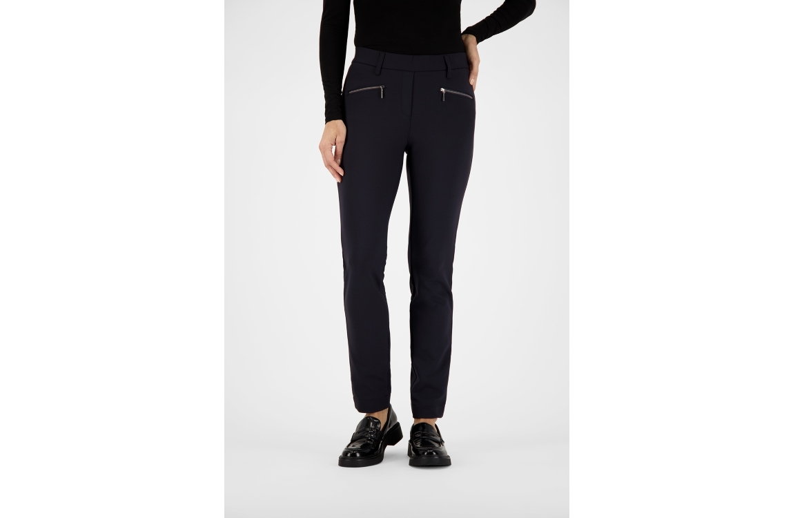 Gardeur broek ZENY 601801 1068. Dit regular fit model sluit door middel van een elastische boord en is voorzien van ceintuurlussen. Deze donkerblauwe broek van Gardeur beschikt over twee ritszakken aan de voorzijde en twee paspelzakken aan de achterzijde.