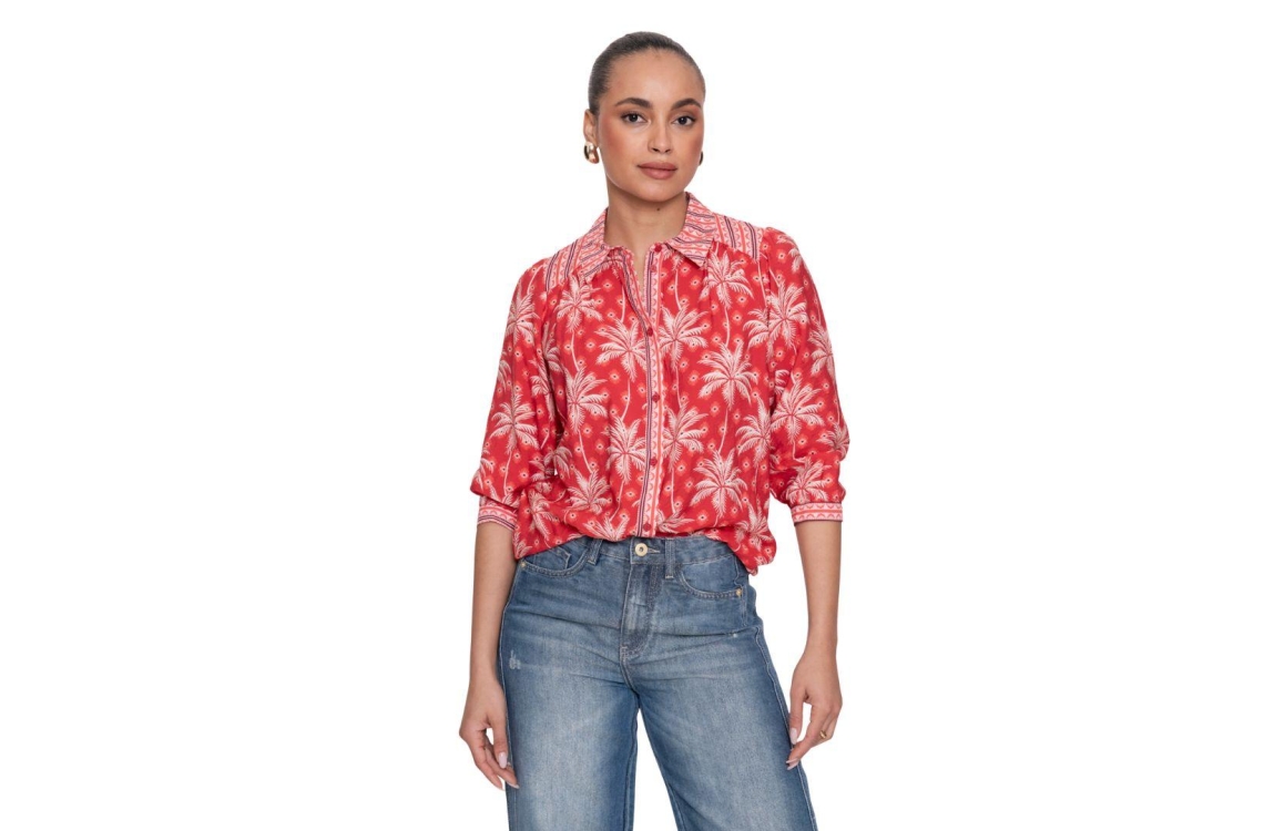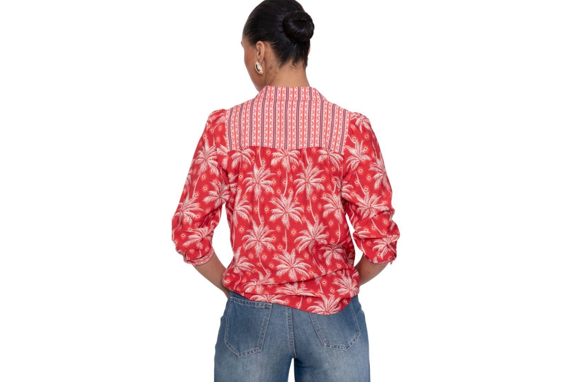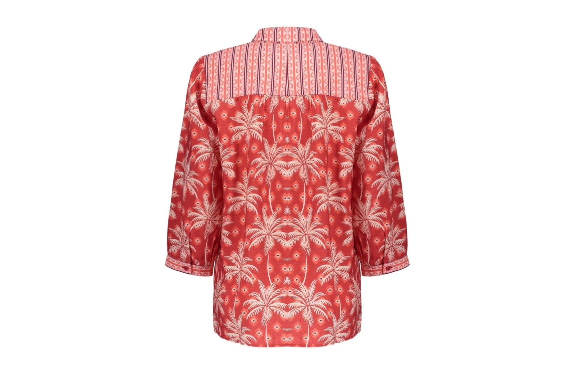 Geisha blouse 63211-20 450. Dit soepelvallende model heeft een kraag en driekwart mouwen. Deze rode blouse van Geisha sluit aan de voorzijde door middel van knopen en is all-over bewerkt met een grafische print in verschillende kleuren.