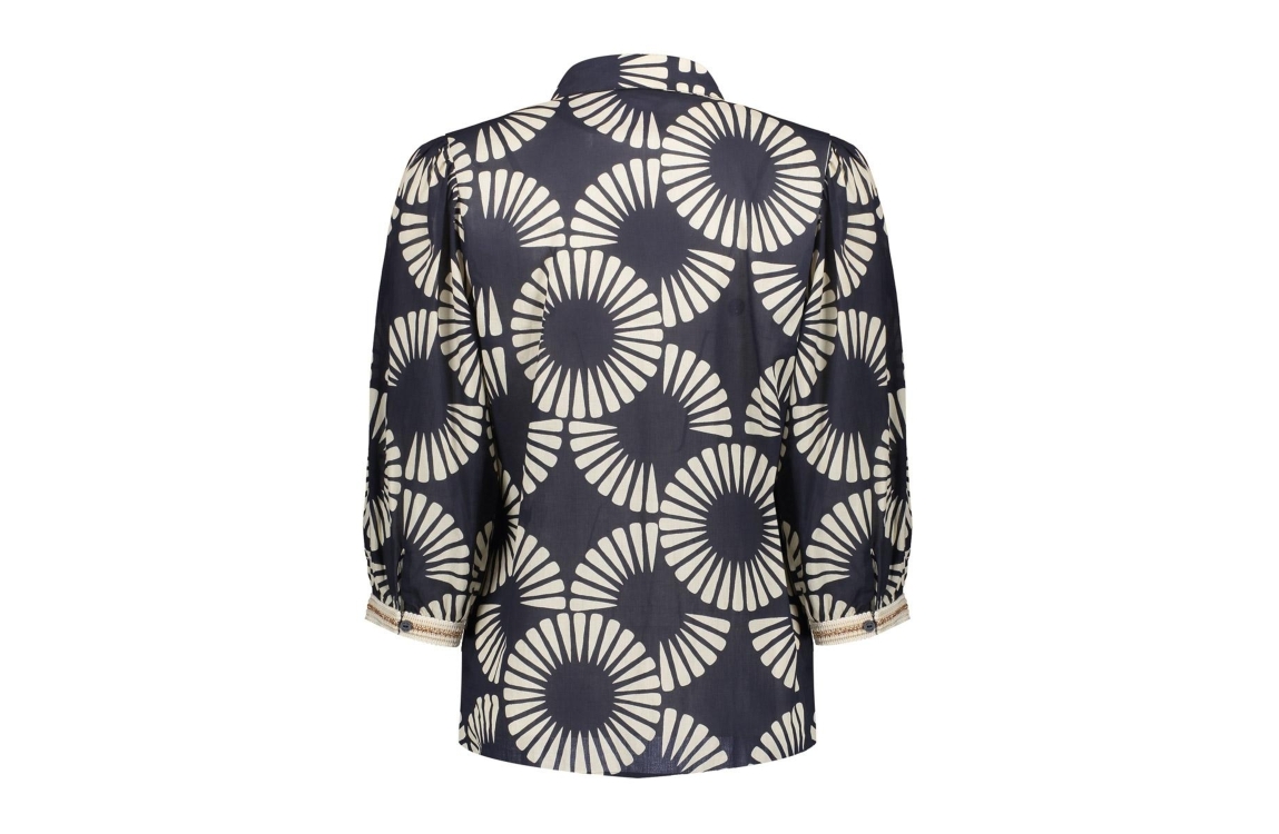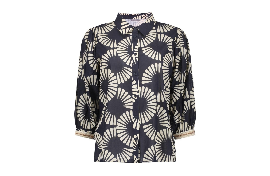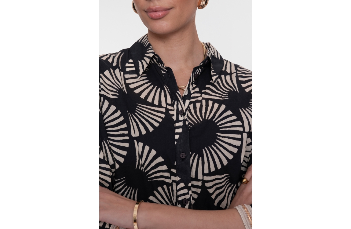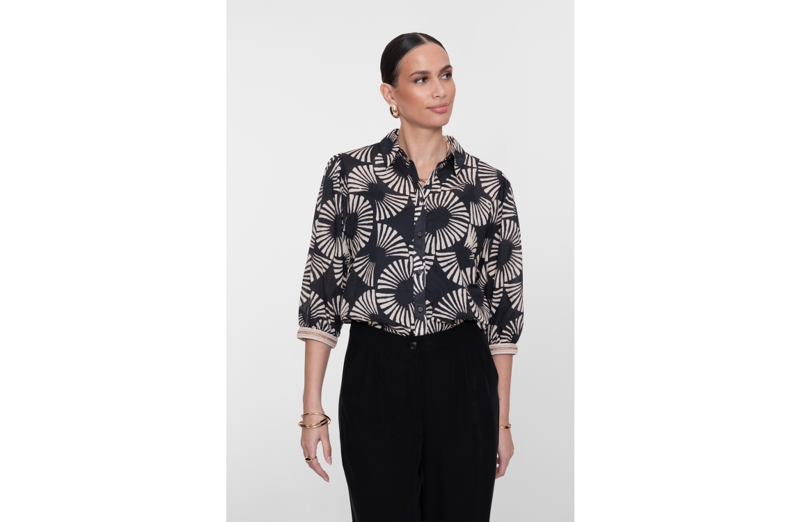 Geisha blouse 999 Black. Dit rechtvallende model heeft een klassieke kraag en driekwartmouwen afgewerkt met een subtiel tapedetail aan de boord. Deze zwarte blouse van Geisha is uitgevoerd in een grafisch waaierpatroon in zwart en beige.