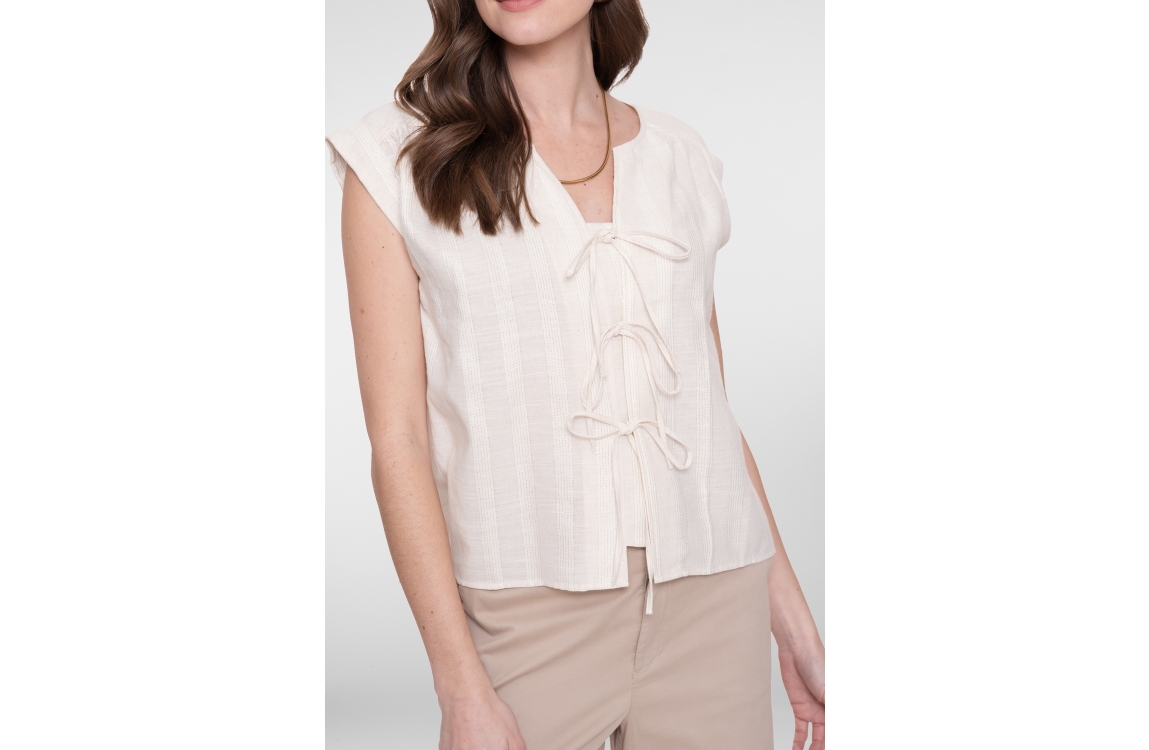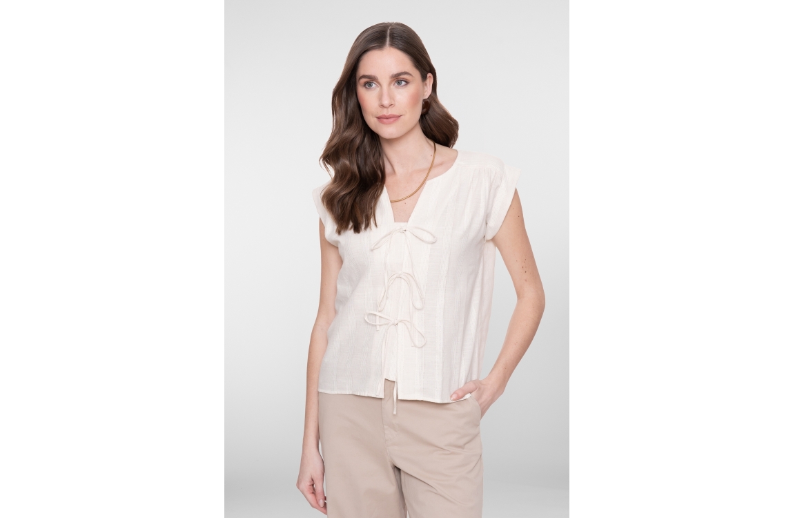 Geisha blouse bow 63152-32. Dit rechtvallend model is voorzien van een ronde hals met v-inkeping en heeft korte mouwen. Deze zandkleurige blouse van Geisha sluit door middel van strikjes aan de voorzijde en is bewerkt met goudkleurige lurexdraden all-over.