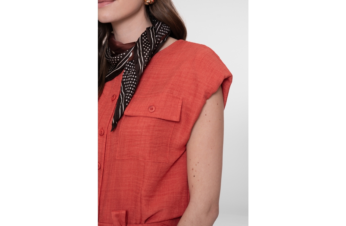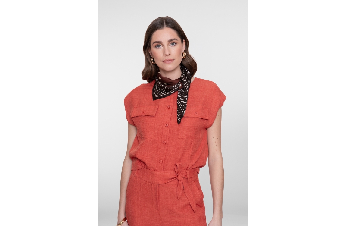Geisha Blouse with pockets 00201 Burned orange. Dit rechtvallende model is voorzien van een ronde hals en is mouwloos. Deze oranje blouse van Geisha sluit door middel van knopen aan de voorzijde en is voorzien van borstzakken. Dit model is afgewerkt met een elastische tailleband.
