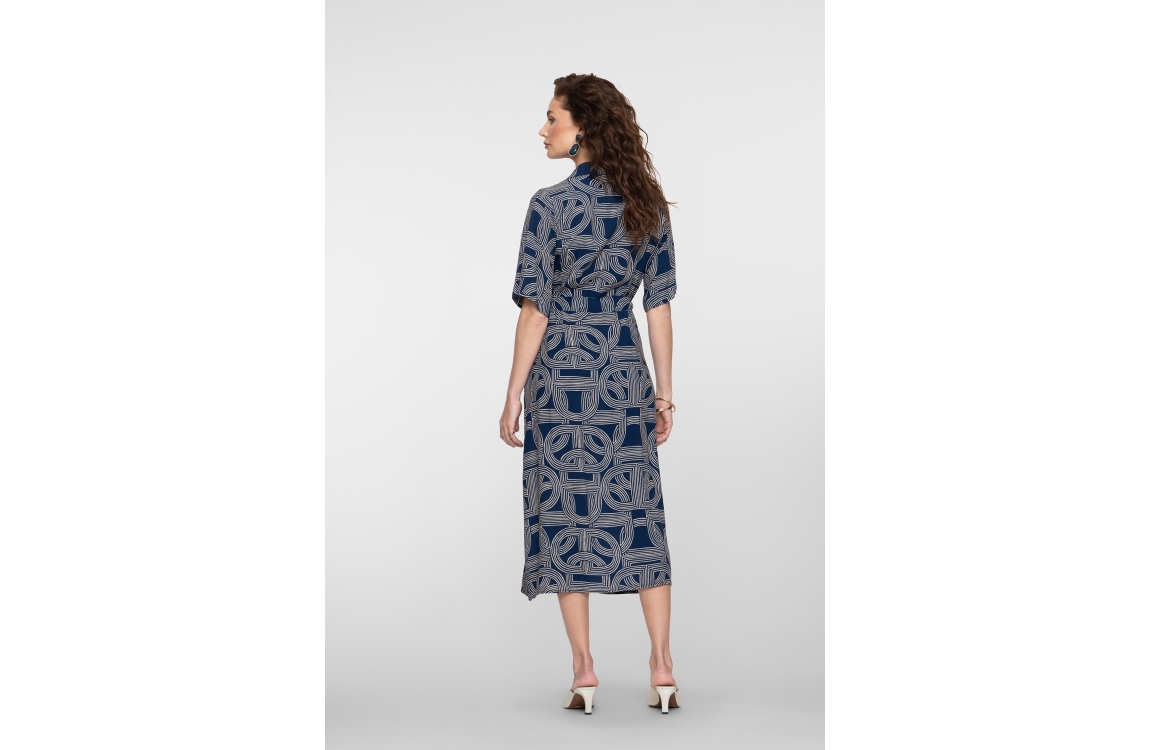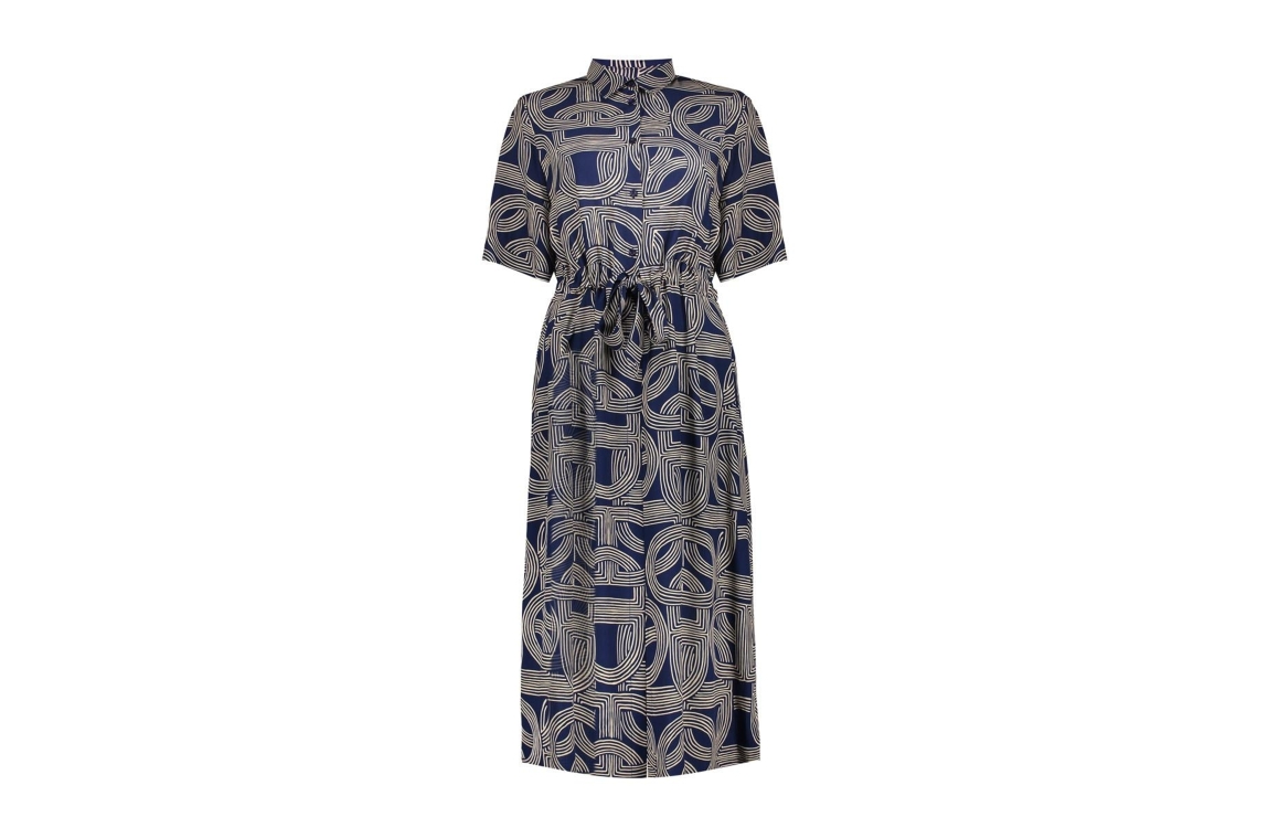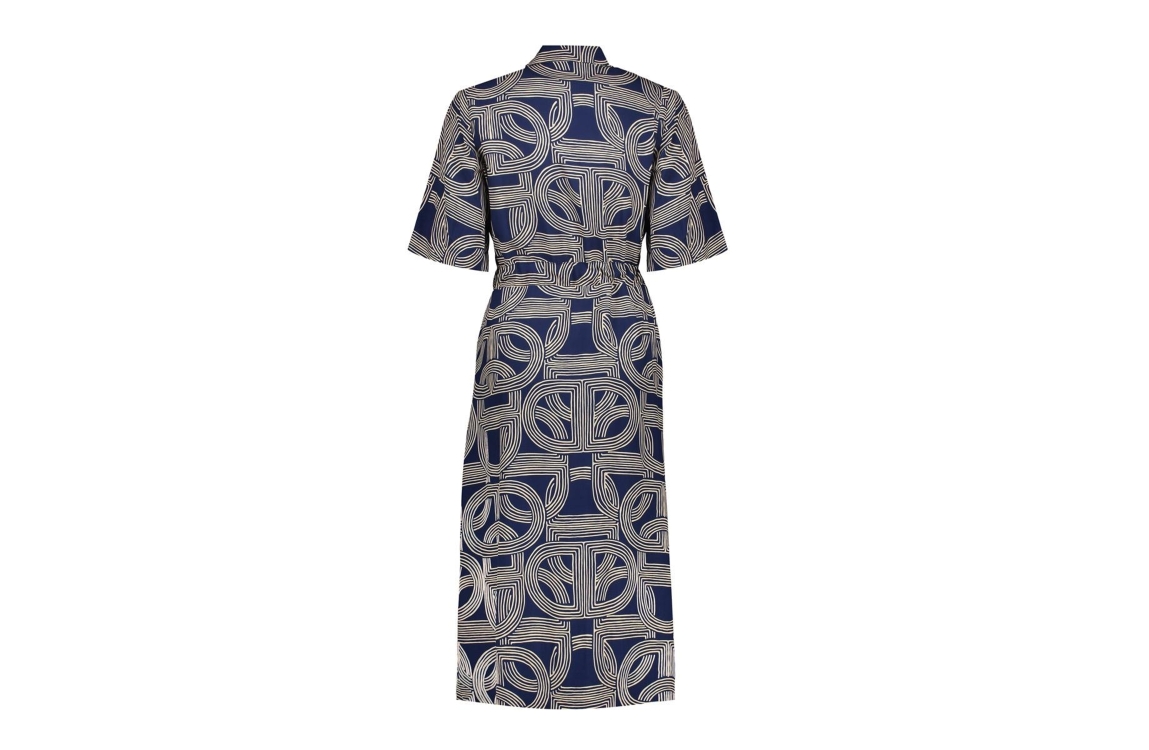 Geisha jurk 67053-70. Dit rechtvallend model is voorzien van een kraag en heeft korte mouwen. Deze donkerblauwe jurk van Geisha sluit door middel van knopen en een strikkoord in de taille. Dit model is all-over bewerkt met een grafische print.