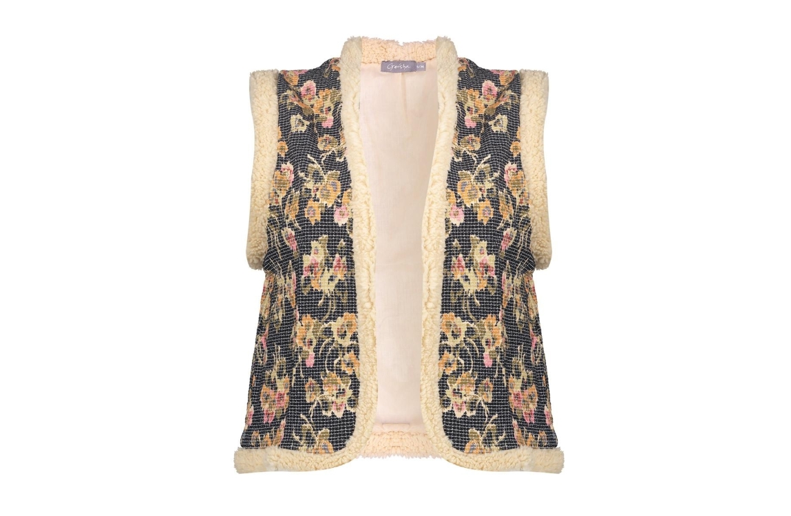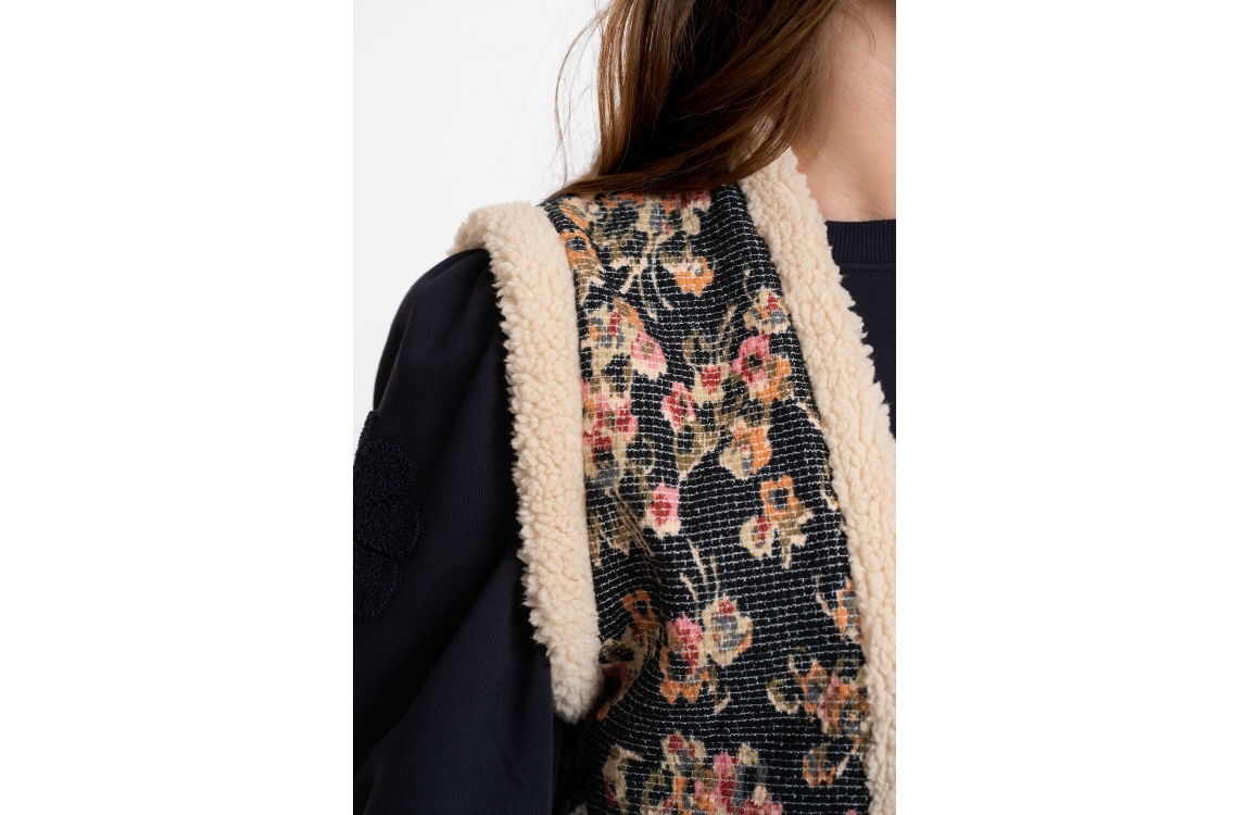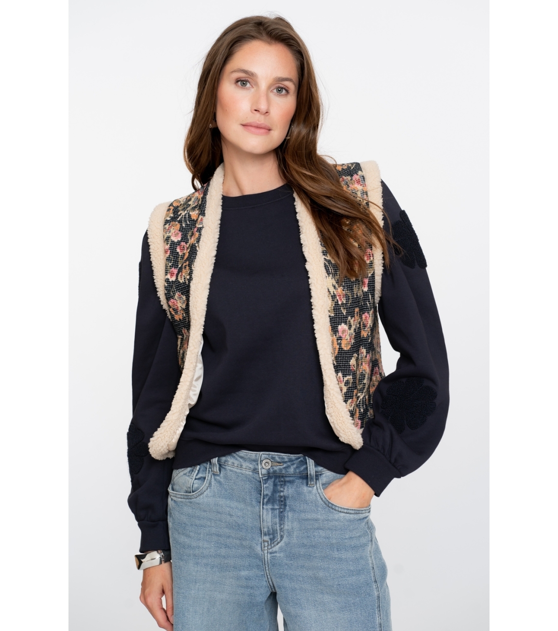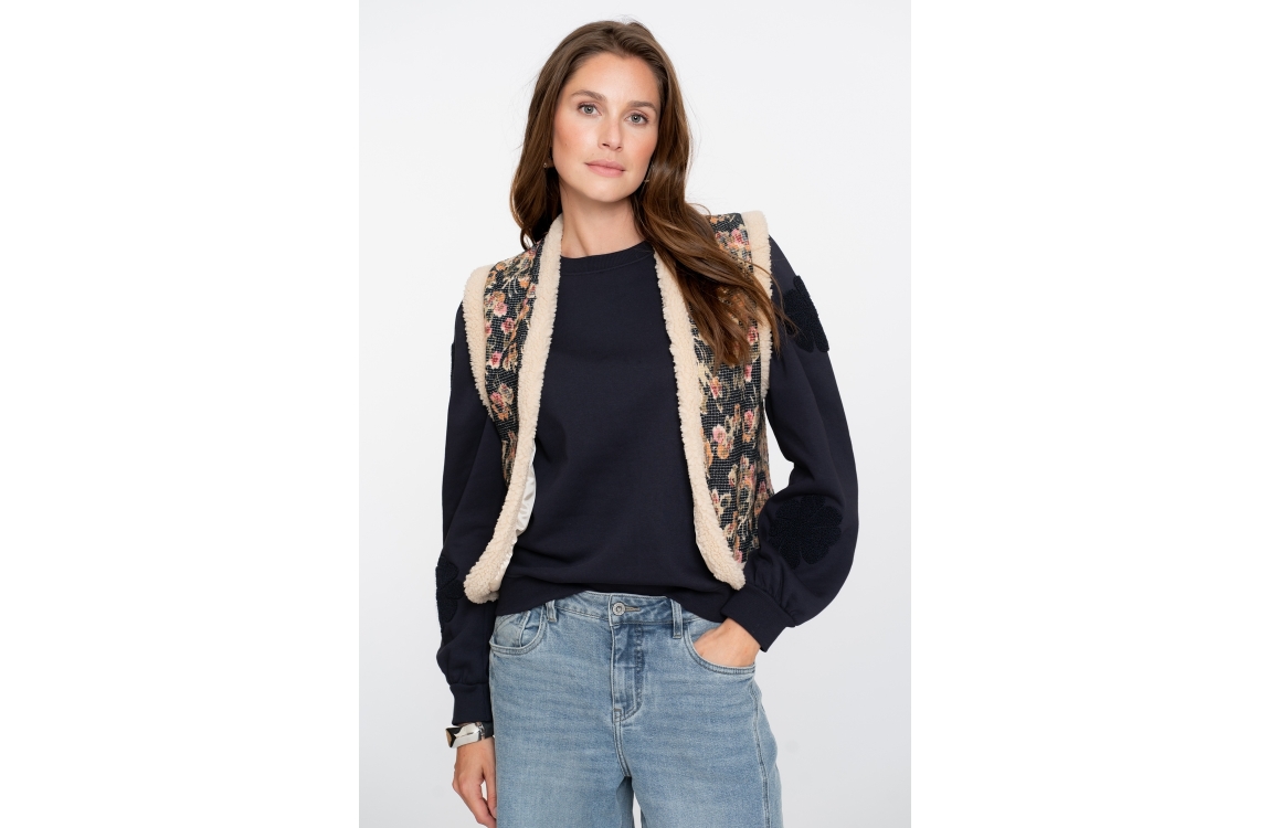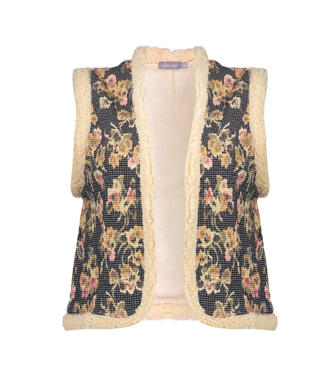 Geisha gilet 55717-20. Dit rechtvallend model heeft een ronde hals en is mouwloos. Deze blauwe gilet van Geisha is uitgevoerd met en bloemenprint. Dit model is afgewerkt met faux fur boorden.