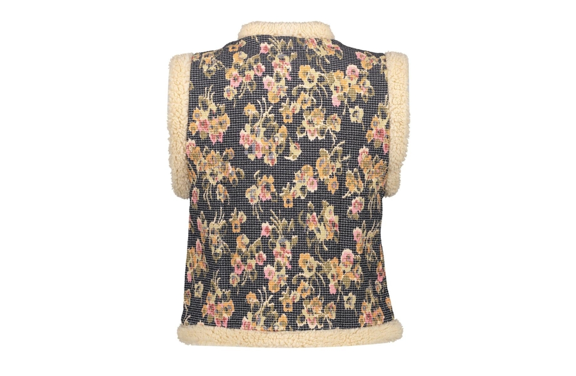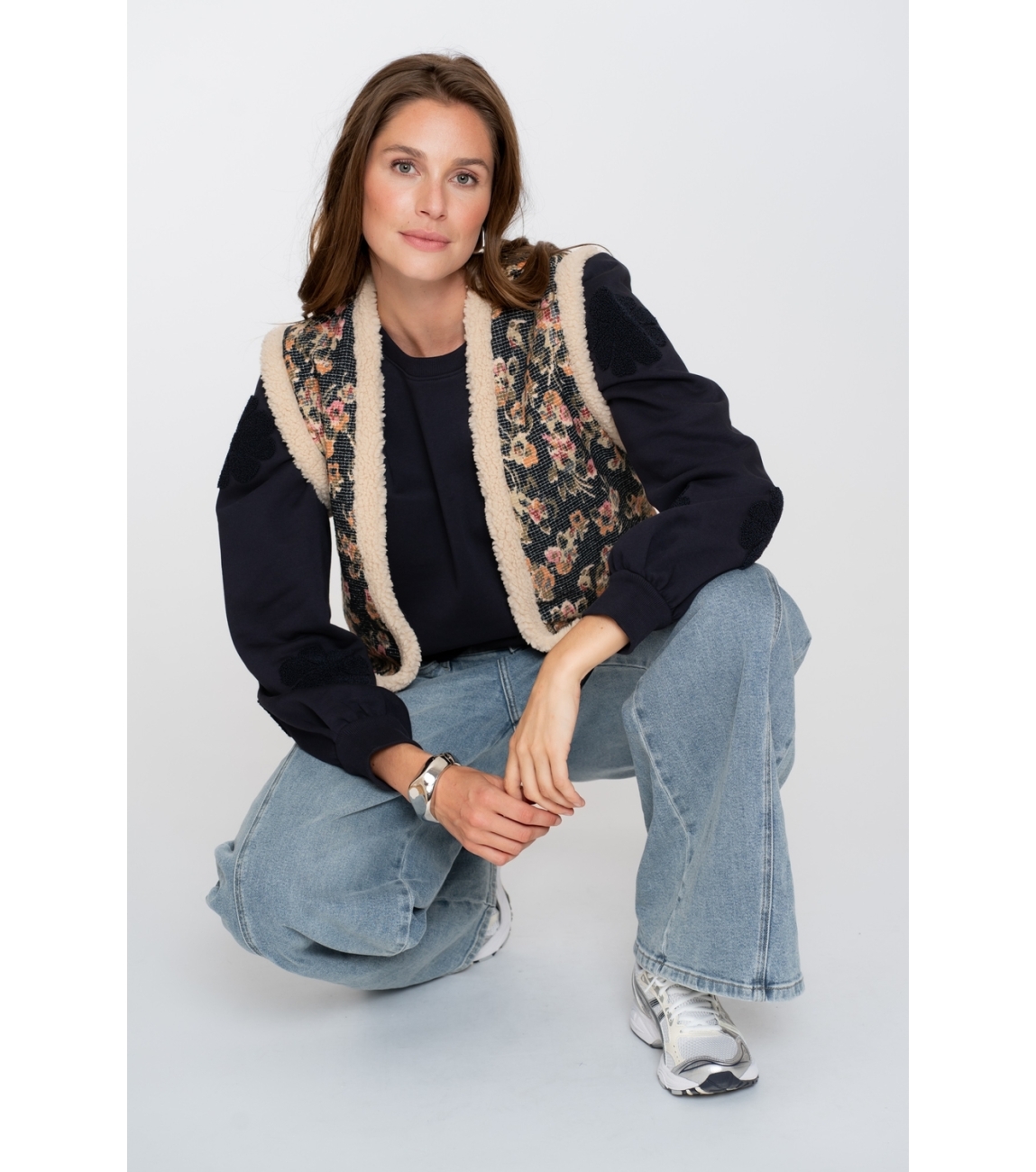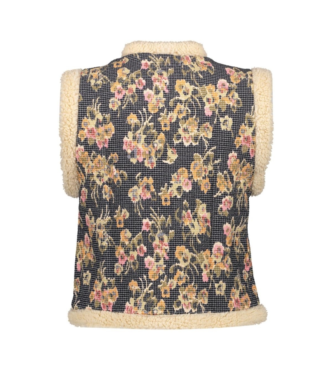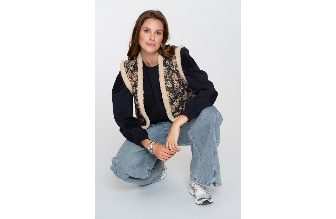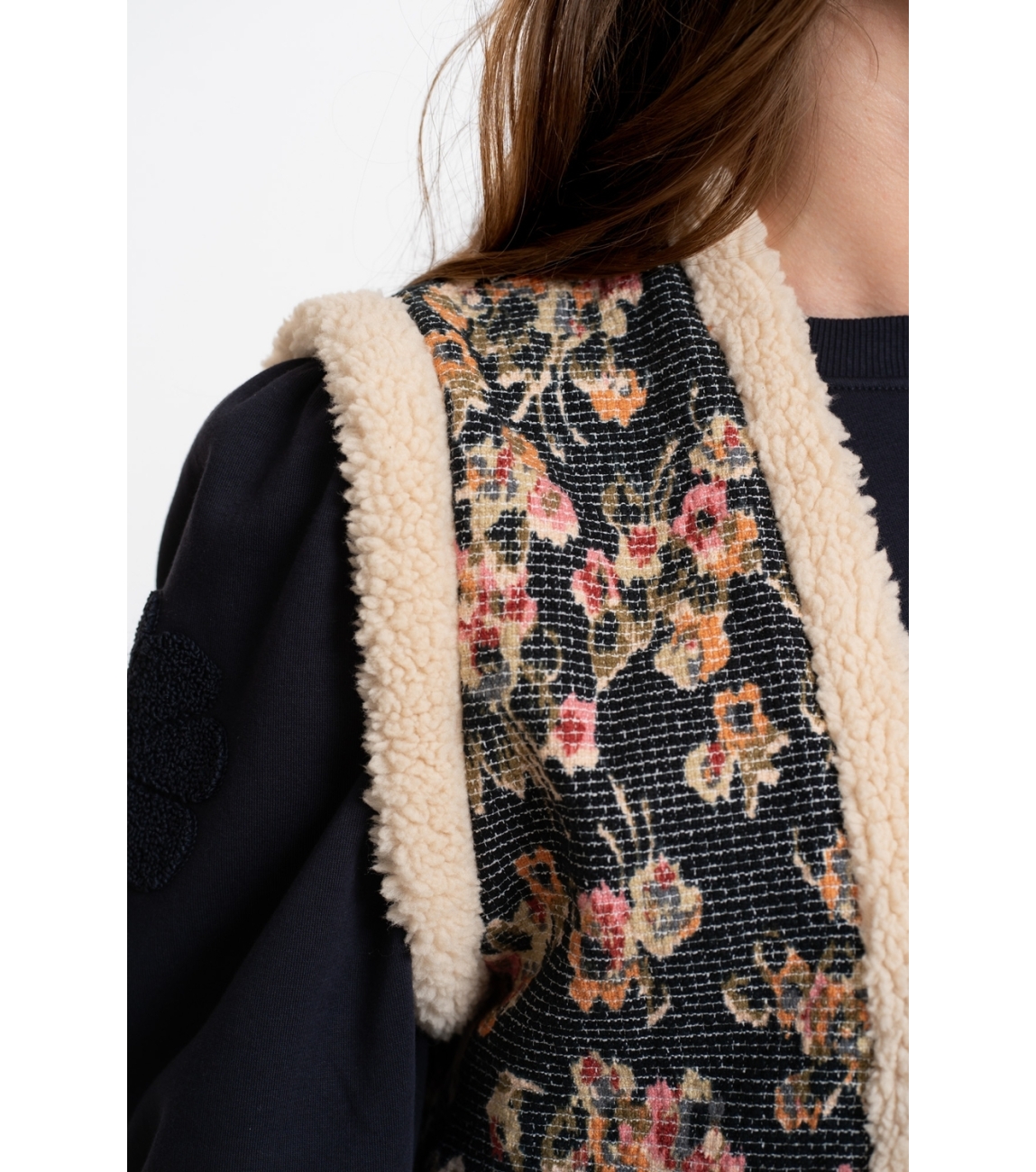 Geisha gilet 55717-20. Dit rechtvallend model heeft een ronde hals en is mouwloos. Deze blauwe gilet van Geisha is uitgevoerd met en bloemenprint. Dit model is afgewerkt met faux fur boorden.