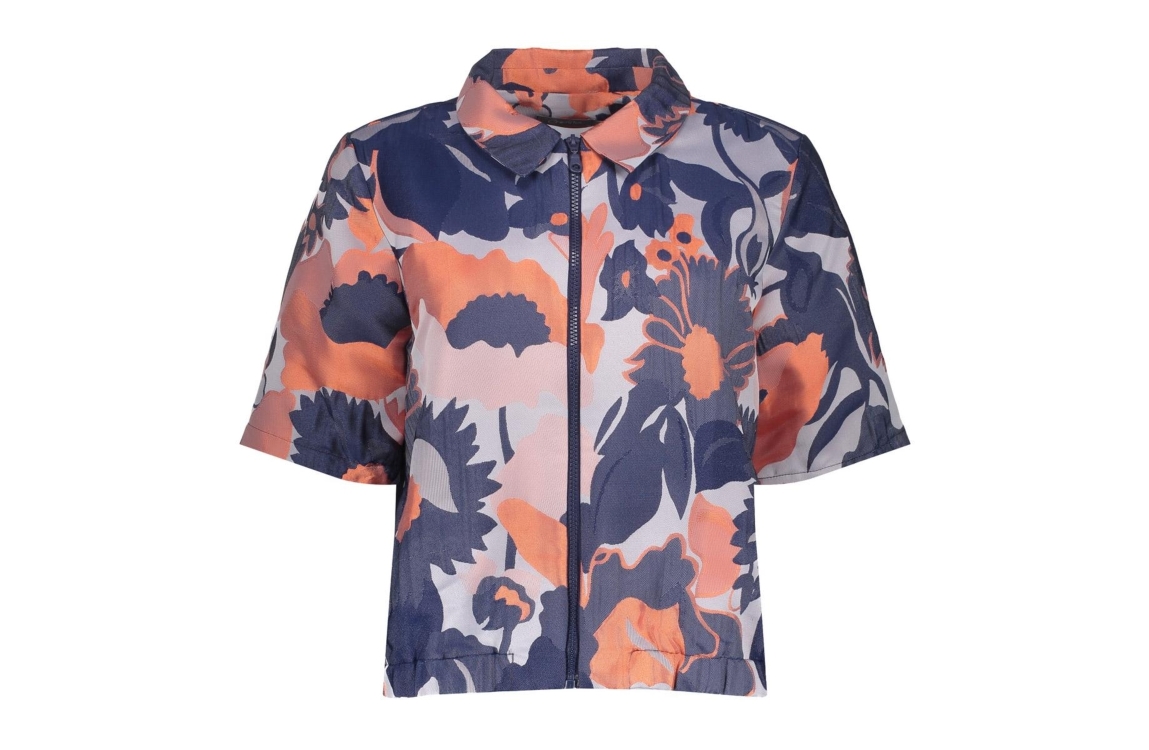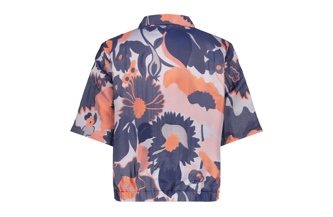 Geisha jacket 65103-20. Dit rechtvallend model is voorzien van kraag en heeft korte mouwen. Dit blauwe/korale jasje van Geisha sluit door middel van een rits en is bewerkt met een bloemenprint. Dit model is uitgevoerd in een glanzende stof afgewerkt met een elastische boord aan de onderzijde.