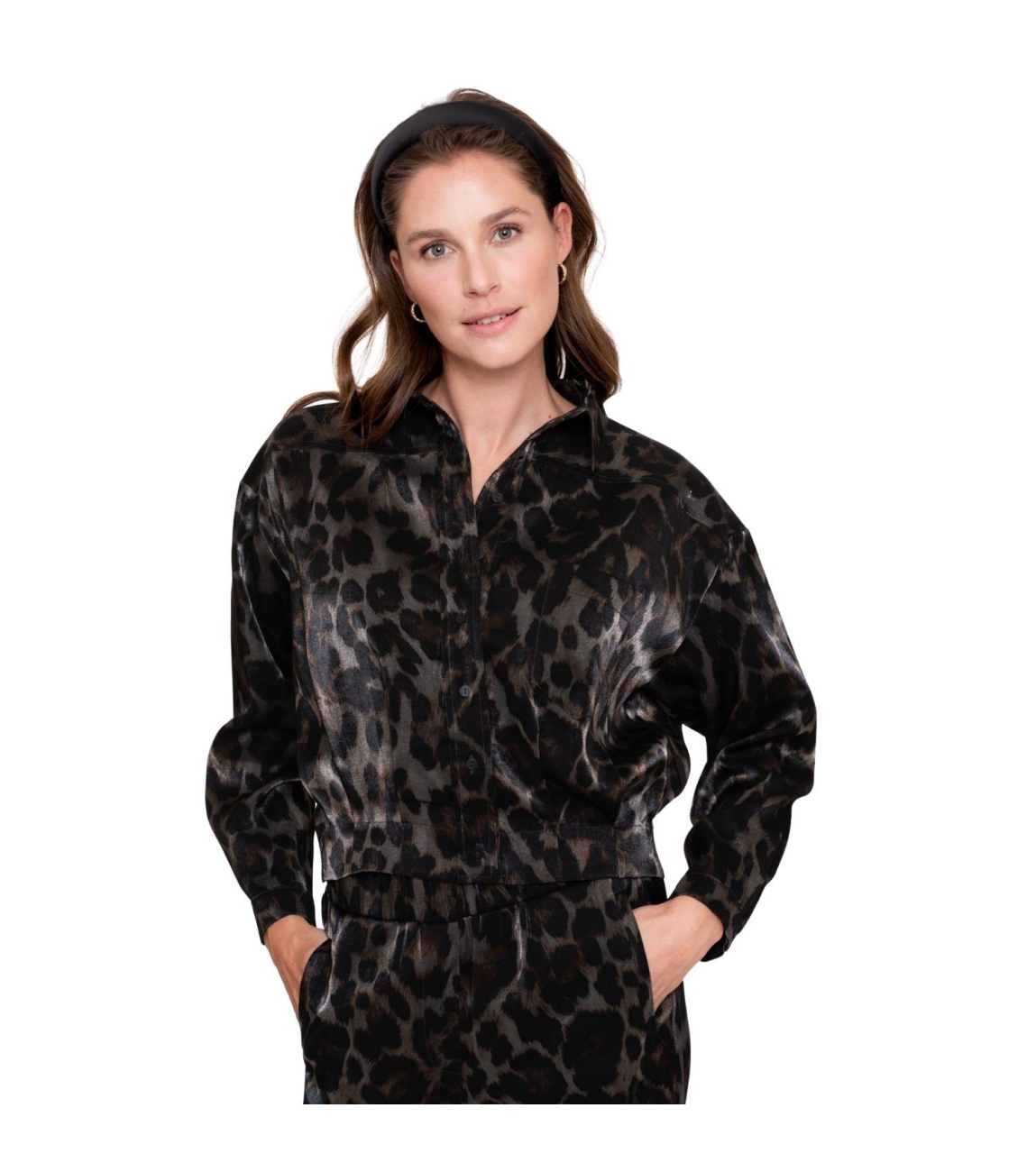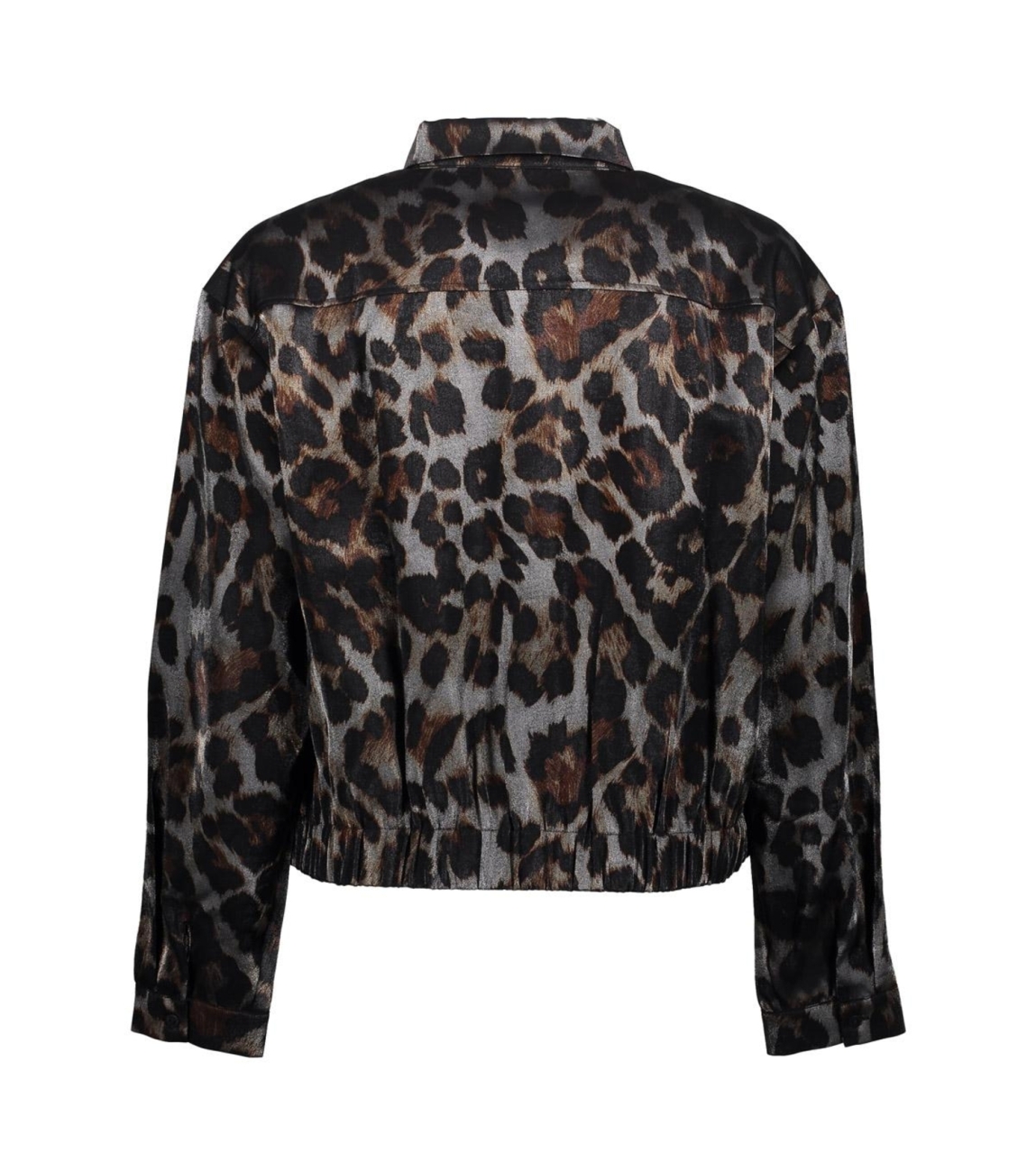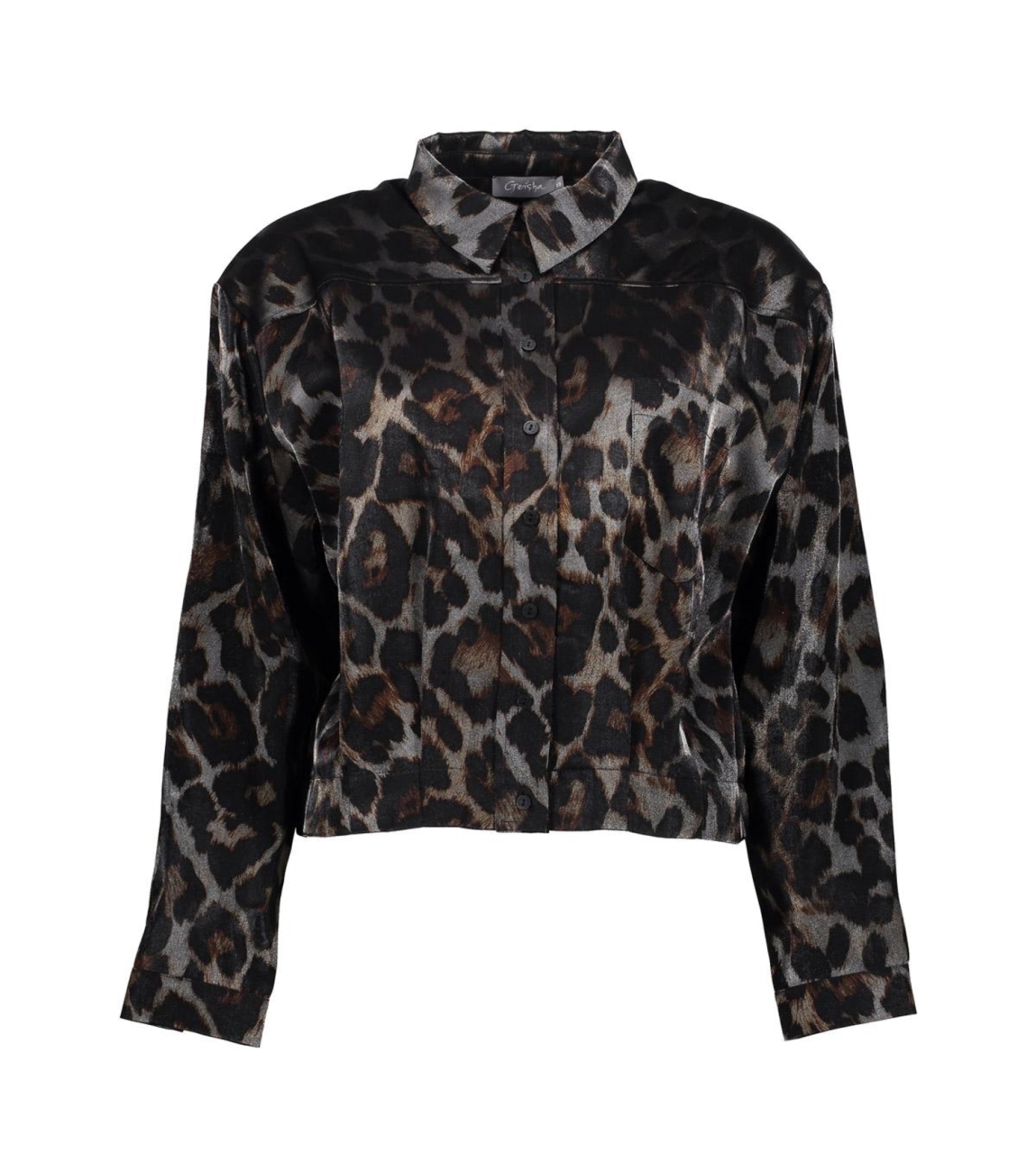Geisha 55723-20 925. Dit rechtvallende model heeft een kraag en lange mouwen. Deze donkergrijze blouse van Geisha sluit aan de voorzijde door middel van knopen en is all-over bewerkt met een leopardprint in een glimmende kwaliteit. Het model is afgewerkt met een elastische zoom en sluitbare manchetten.