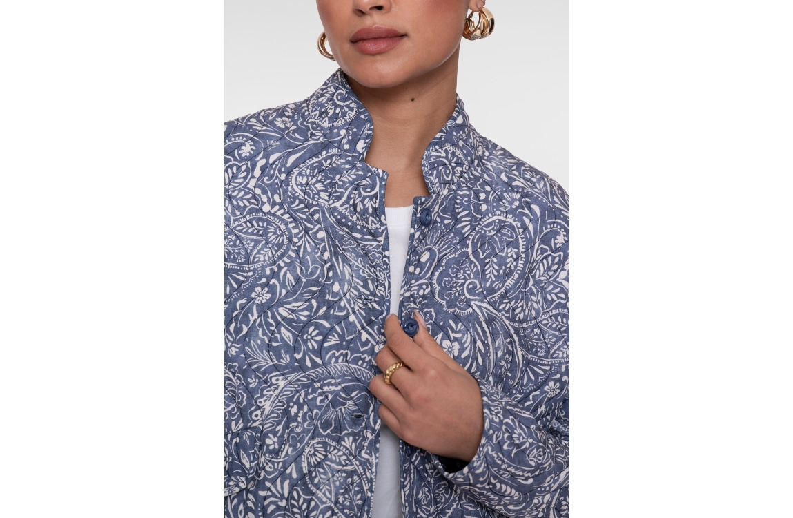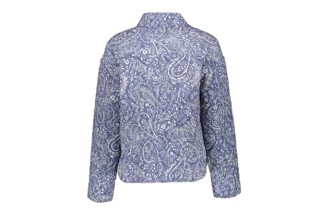 Geisha jacket 65107-70. Dit rechtvallend model is voorzien van een ronde hals en heeft lange mouwen. Dit blauwe jasje van Geisha sluit door middel van knopen en beschikt over twee klepzakken. Dit model is bewerkt met een witte paisley print.