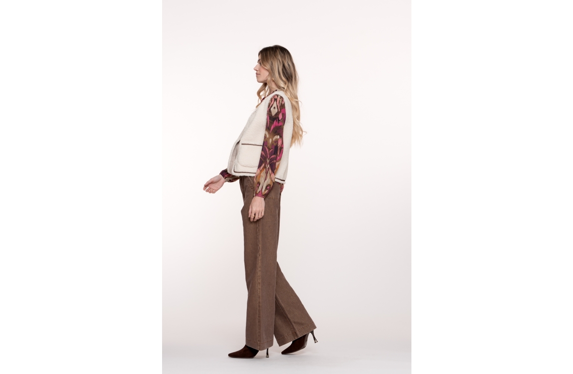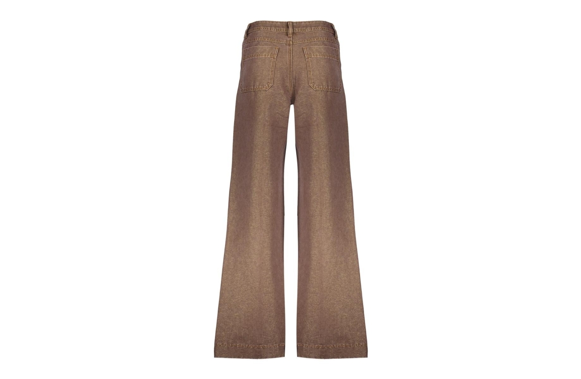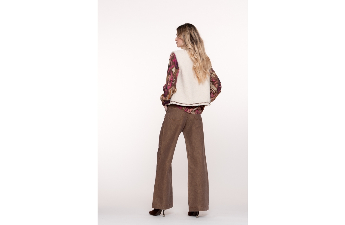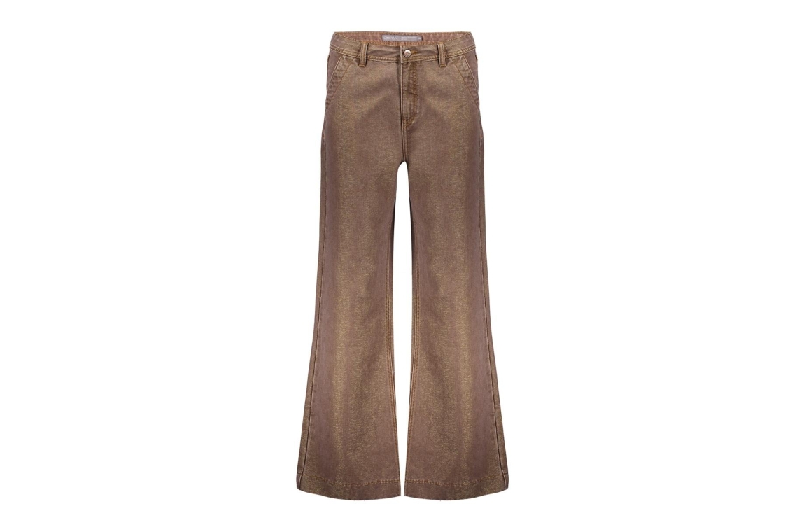 Geisha broek 51515-10. Dit wijdvallende fit model sluit door middel van een knoop en ritsaansluiting en heeft ceintuurlussen. Deze bruine Geisha broek is uitgevoerd in een glitter-coating. Dit model beschikt over twee steekzakken aan de voor- en achterzijde.