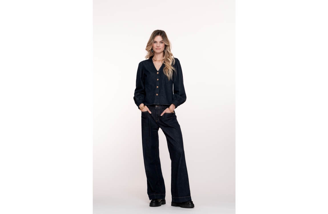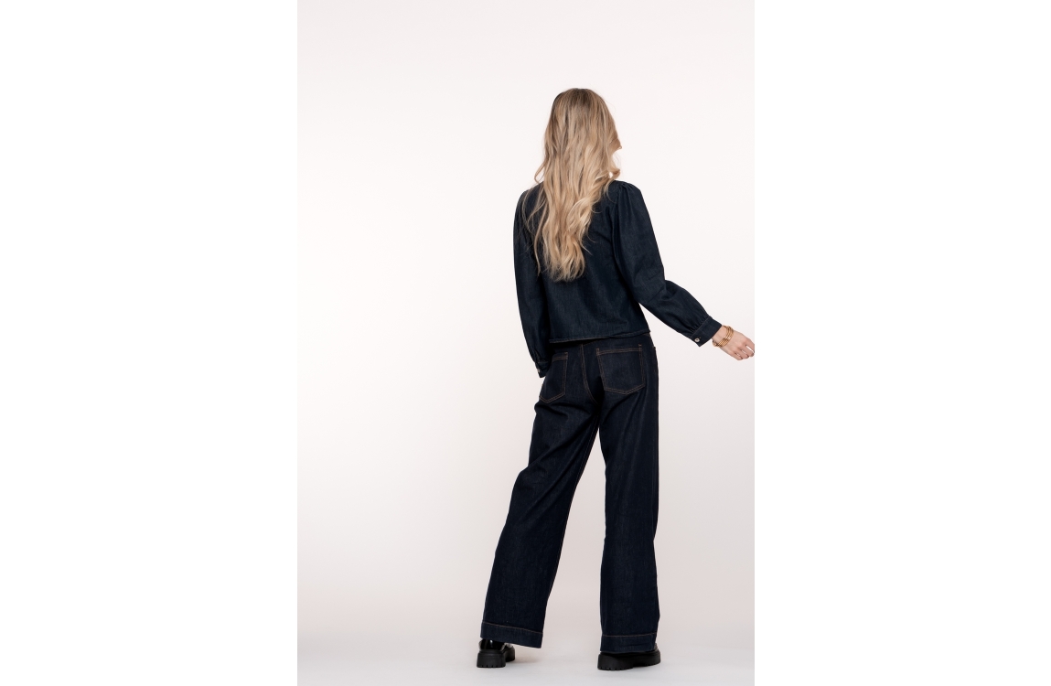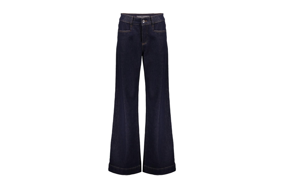 Geisha broek 51521-10. Dit wijdevallend model sluit door middel van knoop en ritsaansluiting en heeft ceintuurlussen. Deze Donker blauwe denim Geisha broek beschikt over twee steekzakken aan de voor- en achterijzde.