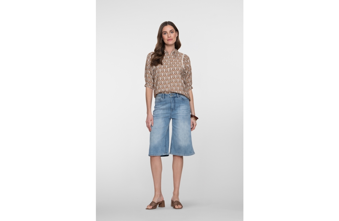 Geisha Jeans short long 835 Stonebleach denim. Dit rechtvallende model is sluit door middel van een knoop en rits sluiting. Deze blauwe bermuda van Geisha is voorzien van steekzakken aan de voor- en achterzijde. Dit model heeeft wijde, ruimvallende pijpen en valt op de knie.