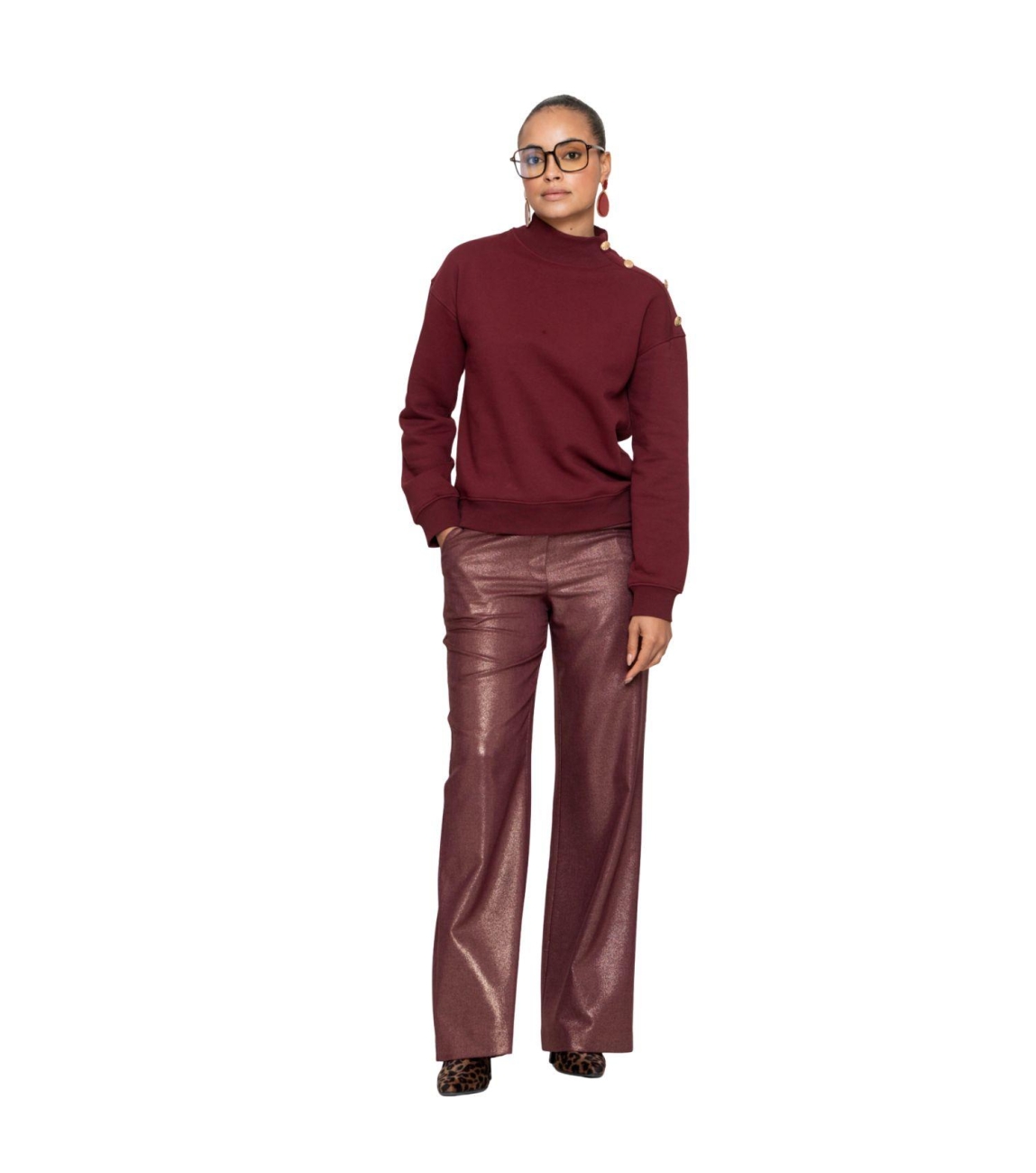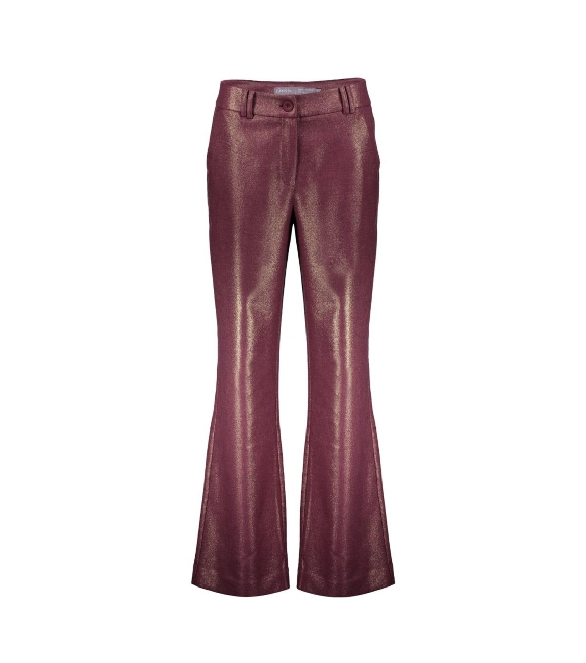 Geisha broek 51581-32. Dit straight fit model sluit door middel van een knoop en rits en is voorzien van dubbele ceintuurlussen. Deze bordeauxrode broek van Geisha is all-over bewerkt met een shiny coating en heeft steekzakken en fake paspelzakken aan de achterzijde.