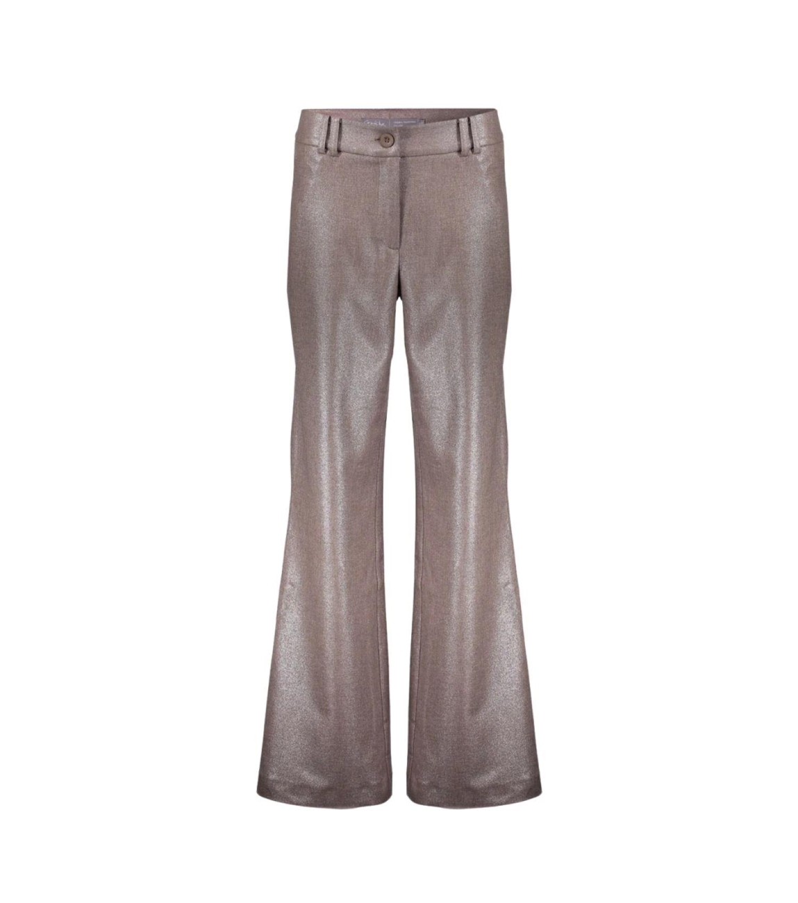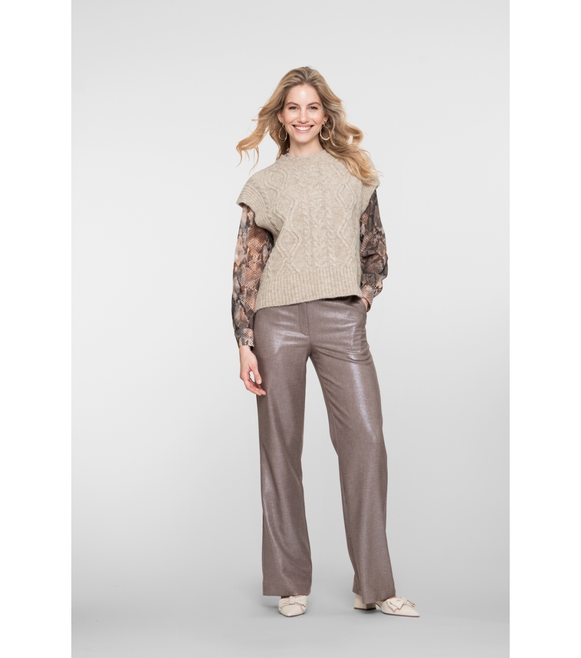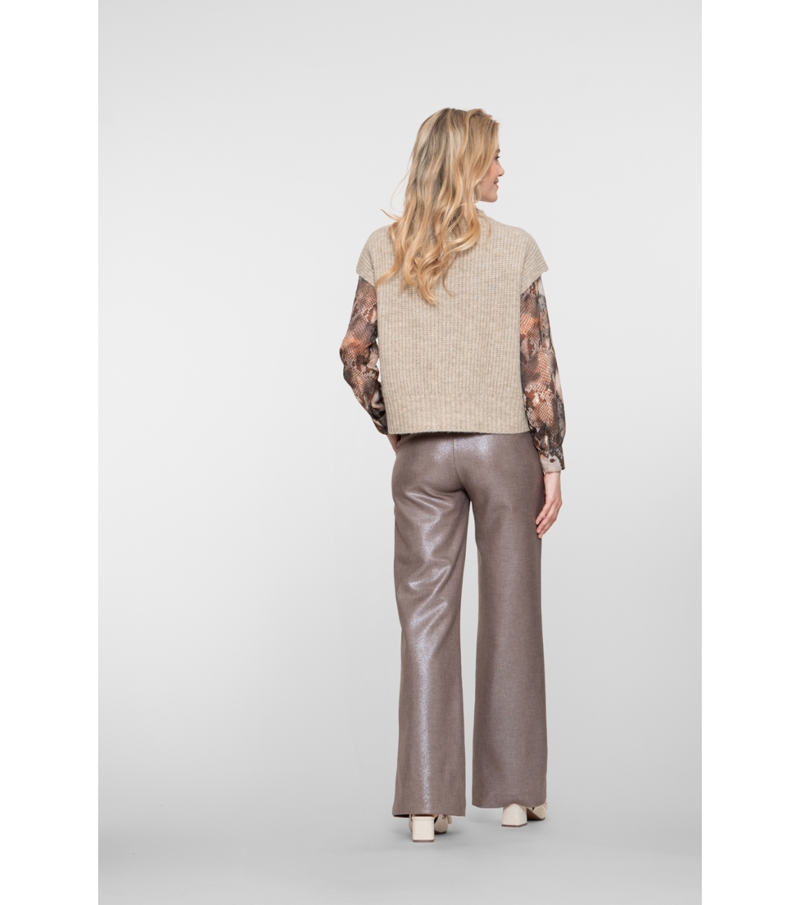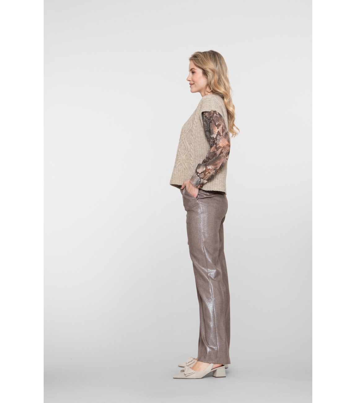 Geisha Pants 745 Taupe. Dit wijdvallende model sluit door middel van een knoop en ritsaansluiting en heeft ceintuurlussen. Deze taupe kleurige broek van Geisha is uitgevoerd in coated materiaal. Dit model is all-over bewerkt met een glinstering en heeft twee decoratieve paspelzakken aan de achterzijde. Het model is 179 cm lang en draagt maat S/36.