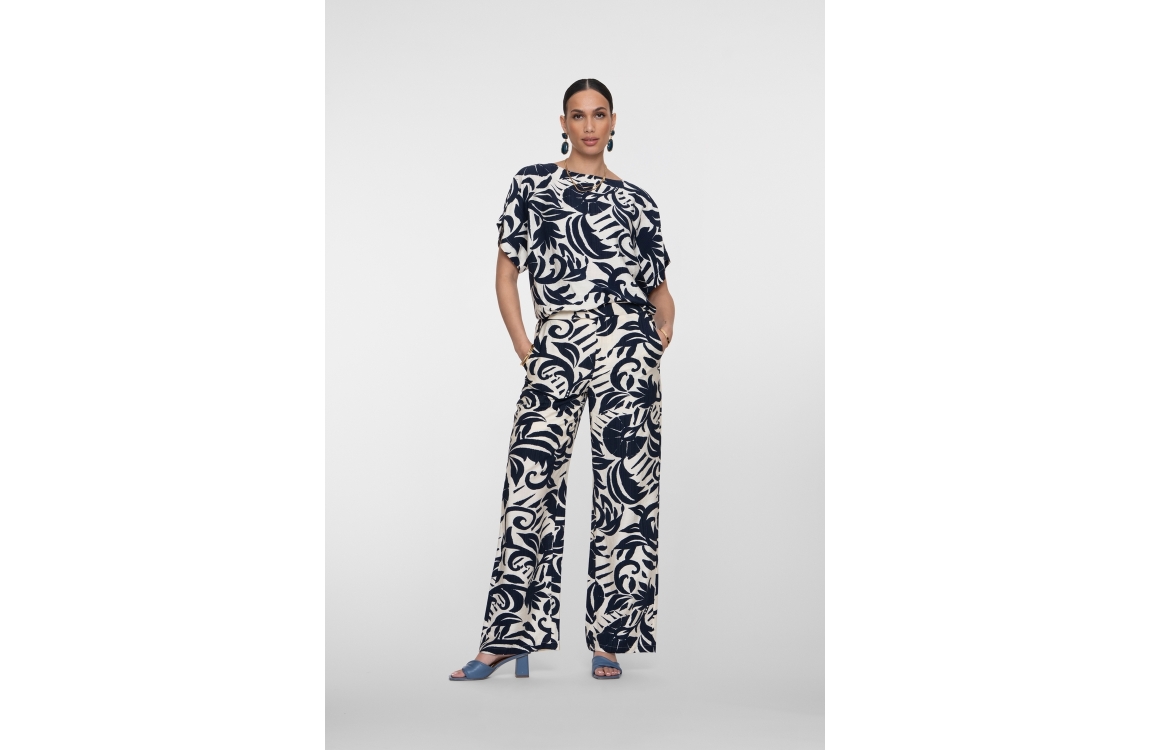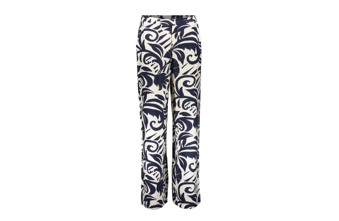 Geisha Pants naive flower 675 Navy. Dit rechtvallende model sluit door middel van een knoop en rits sluiting en heeft uitlopende pijpen. Deze creme kleurige broek van Geisha is all-over bewerkt met een donkerblauwe grafische bloemprint.