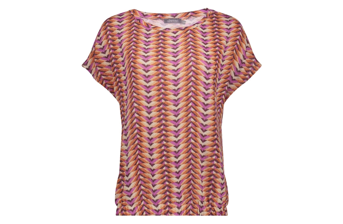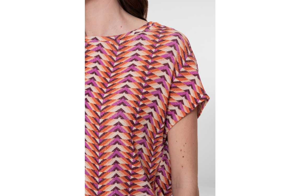 Geisha top 300 Lilac. Dit rechtvallende model is voorzien van een ronde hals en heeft korte afhangende schouders. Deze multicolour top van Geisha is all-over bewerkt met lurex en is uitgevoerd in een kleurrijke aztecprint. Dit model is afgewerkt met een elastische boord.