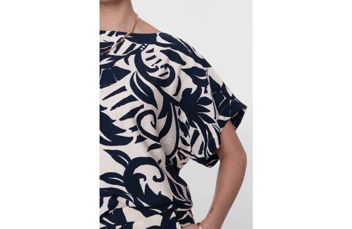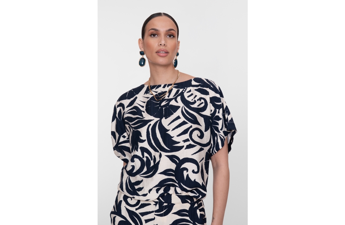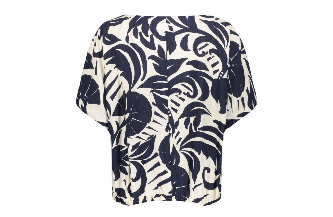 Geisha top 63236-26. Dit rechtvallend model is voorzien van een boothals en heeft korte mouwen. Deze navykleurige top van Geisha is all-over bewerkt met een bloemenprint en is afgewerkt met een elastische boord.