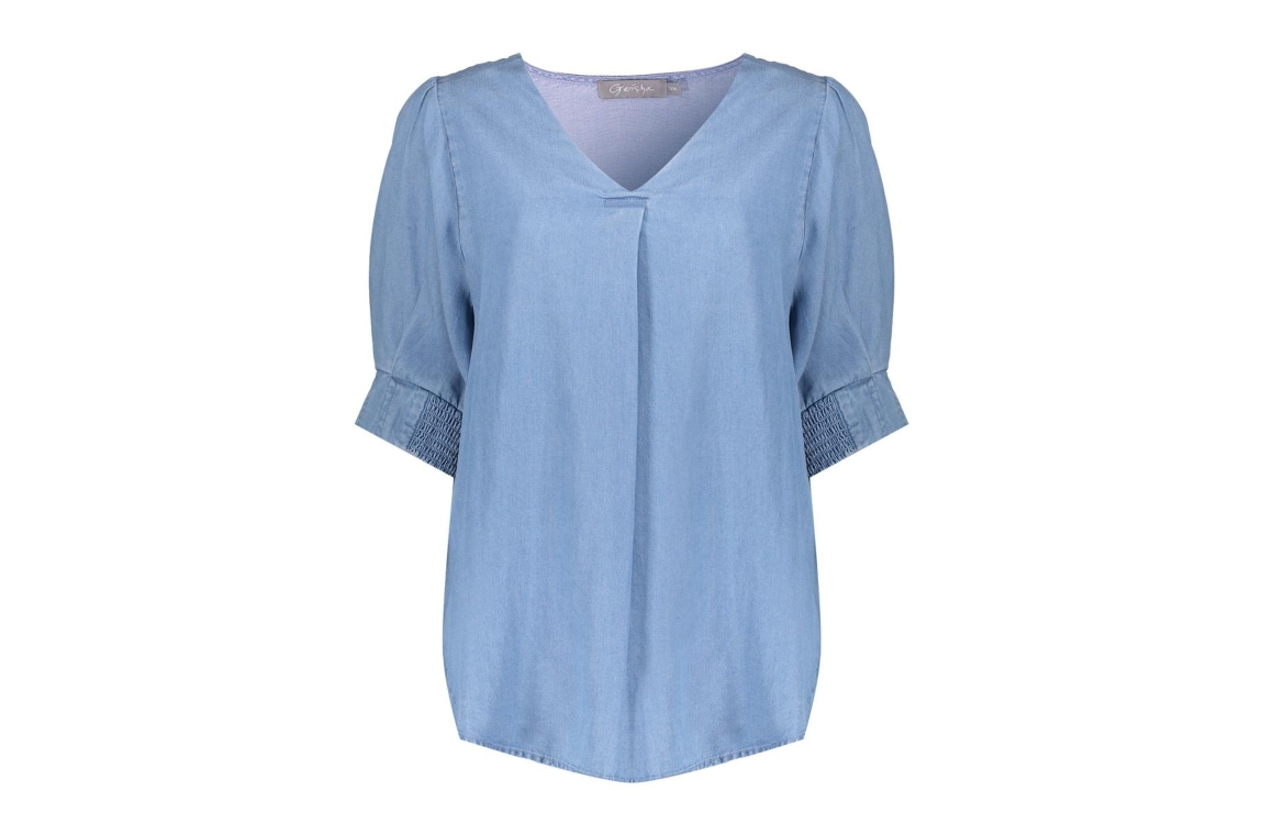Geisha top NIKITA. Dit soepelvallend model is voorzien van een v-hals en heeft korte pofmouwen afgewerkt met knoopsluiting. Deze denim top van Geisha is uitgevoerd in een soepel materiaal.