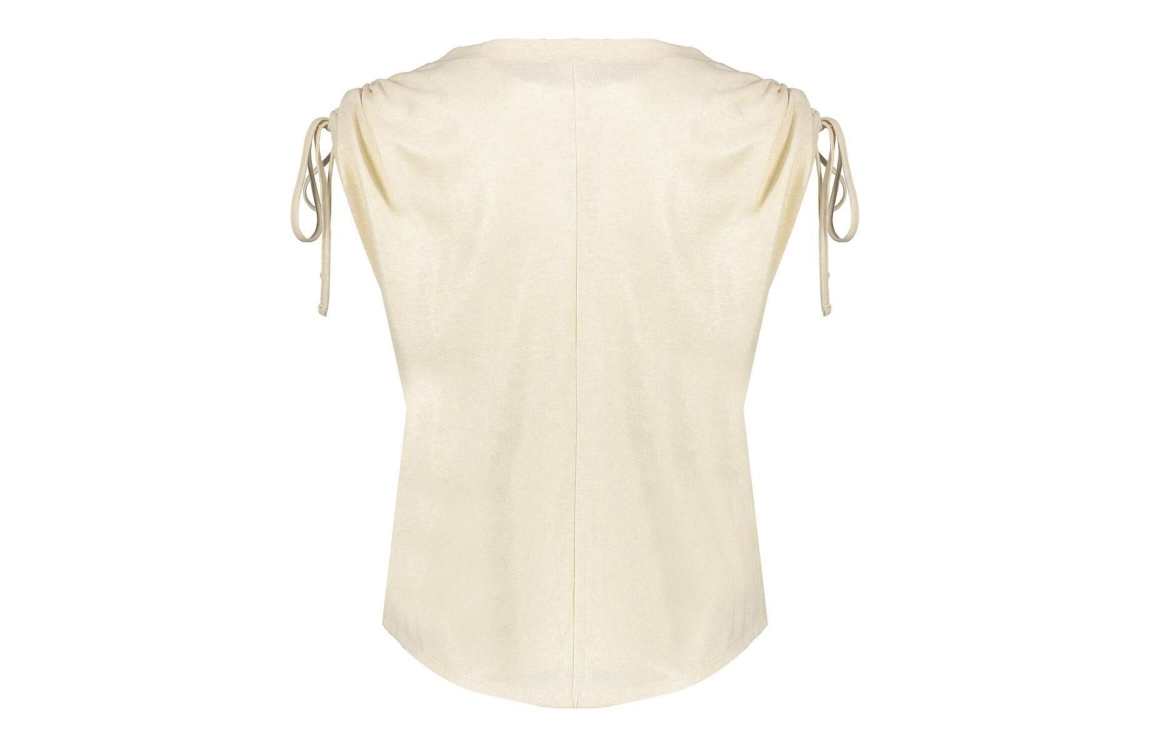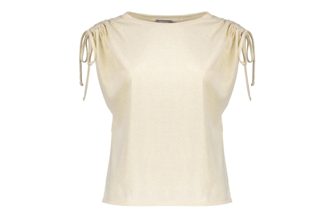 Geisha Online top 52401-41. Dit rechtvallend model heeft een ronde halslijn en is mouwloos. Deze zandkleurige top van Geisha is uitgevoerd met een subtiele glans en heeft geplooide details op de schouders met strikkoorden.