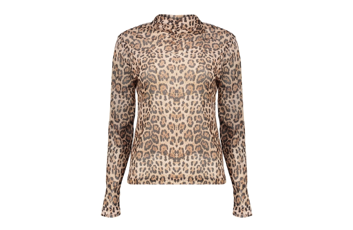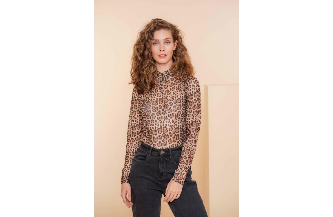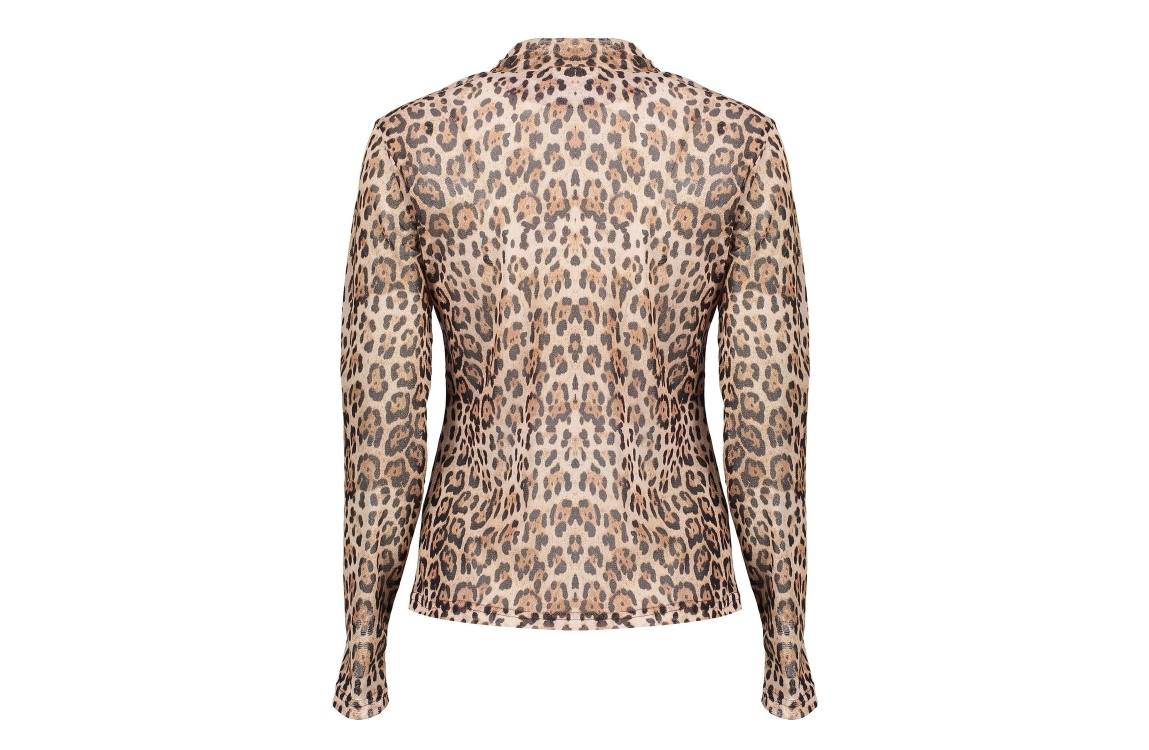 Geisha Online top 43688-20. Dit aangesloten model heeft een hoge hals en lange mouwen. Deze bruine top van Geisha is all-over bewerkt met een panterprint en glitter lurex. Dit model is semi-transparant uitgevoerd en is afgewerkt met gedrappeerde details bij de hals.