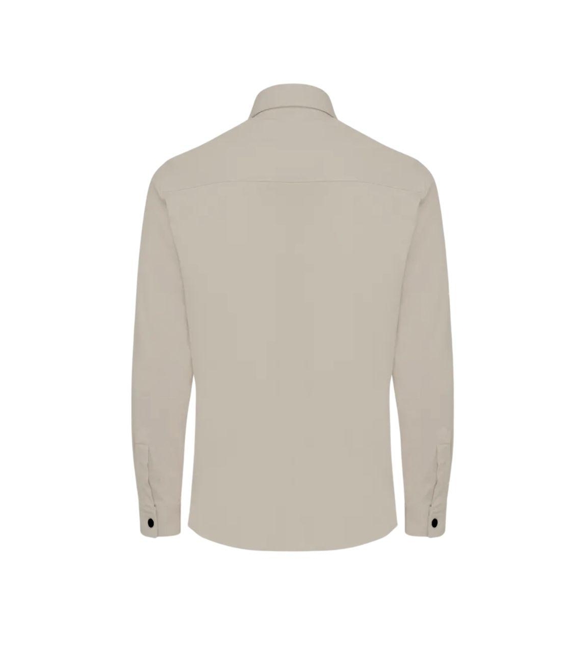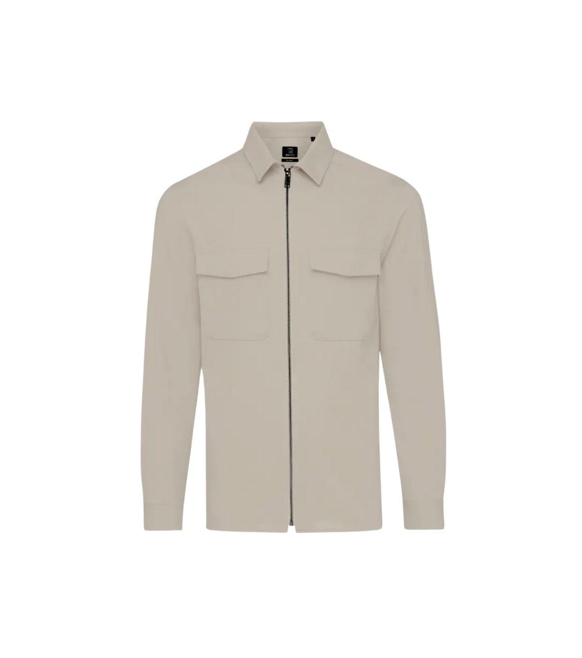 Genti overshirt S2095-1967. Dit rechtvallend model is voorzien van een kraag en heeft lange mouwen. Deze licht bruine overshirt van Genti sluit door middel van een rits en beschikt over twee klepzakken.