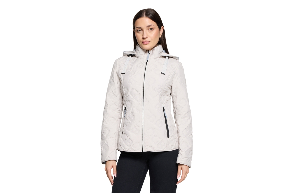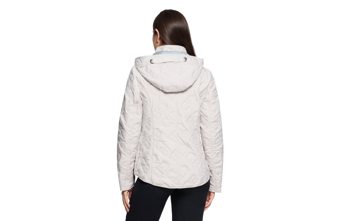 Gil Bret jas 91585230 5538. Dit rechtvallende model heeft een opstaande kraag met afneembare capuchon en lange mouwen. Deze groene jas van Gil Bret sluit aan de voorzijde door middel van een rits en is all-over bewerkt met het merkembleem, uitgevoerd in structuur. Het model is op de linkermouw gedetailleerd met het merkemleem en is voorzien van twee ritszakken.