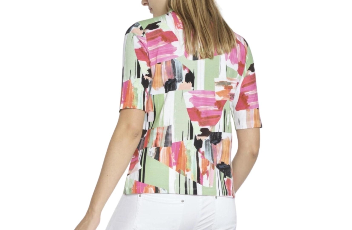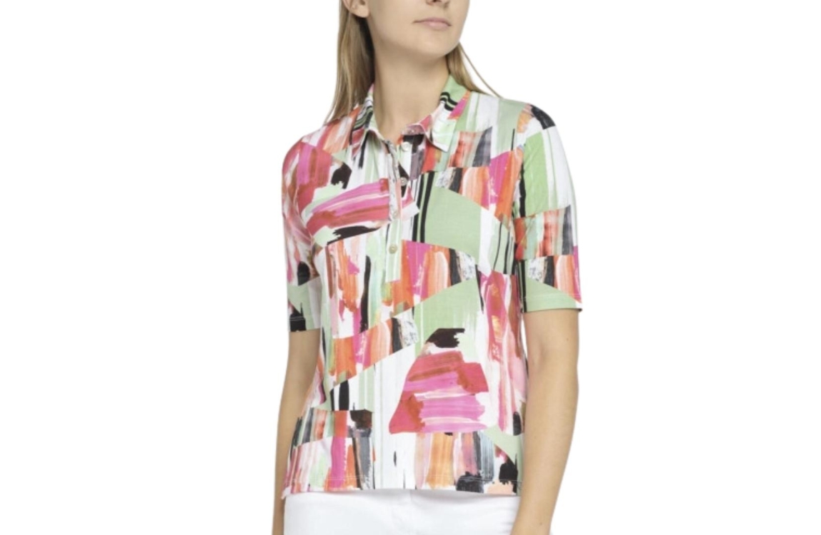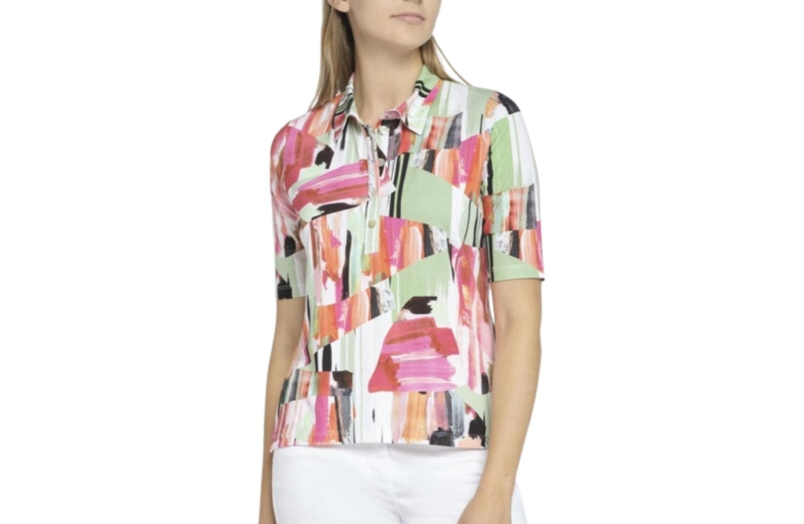 Gollehaug T-shirt 02411-23269. Dit aangesloten model is voorzien van een kraag en heeft korte mouwen. Dit multicolor model van Gollehaug is bewerkt met een all-over grafische print en sluit door middel van knopen aan de voorzijde.