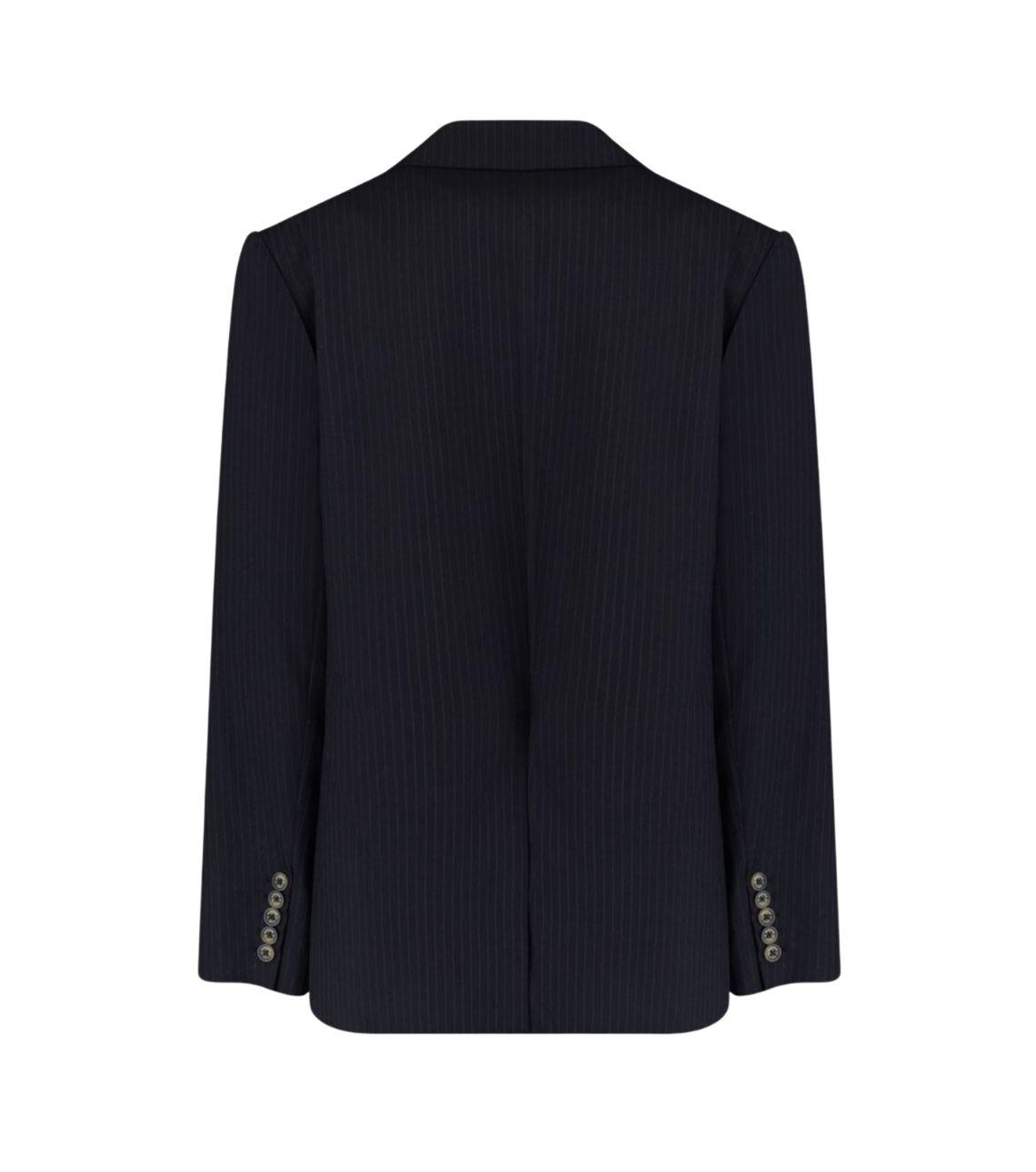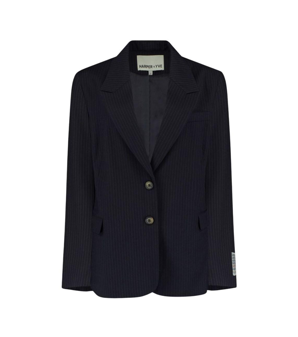 Harper and Yve blazer AW25N218. Dit rechtvallende model heeft een reverskraag en lange mouwen. Deze zwarte Harper and Yve blazer is all-over bewerkt met een donkerblauwe krijtstreepprint. Het model sluit door middel van knopen en beschikt over twee klepzakken aan de voorzijde met een split aan de achterzijde.