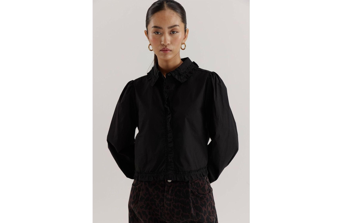 Harper and Yve ELLIE-LS Black. Dit rechtvallende model heeft een omgeslagen kraag en lange mouwen. Deze zwarte blouse van Harper and Yve sluit aan de voorzijde door middel van knopen en is afgewerkt met ruffles en plooidetails op de boorden en achterzijde.