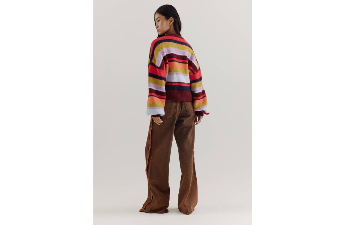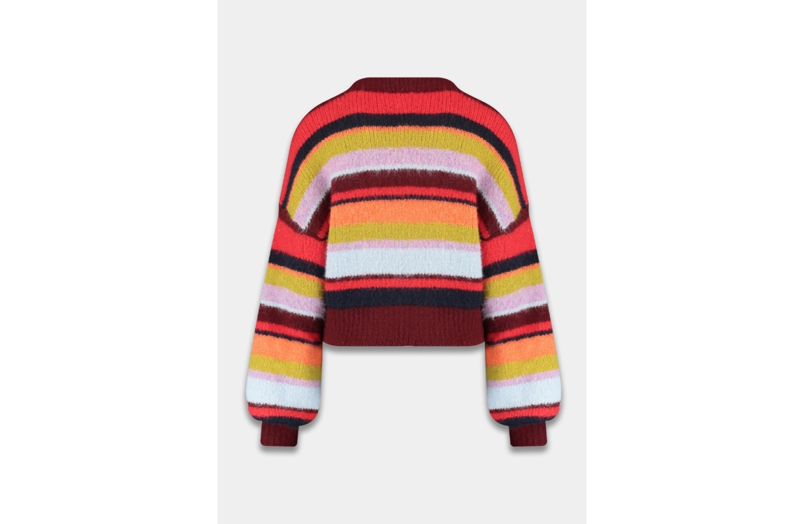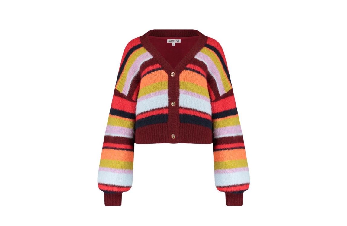 Harper & Yve Noor AW25W800. Dit oversized model is voorzien van een v-hals en heeft lange mouwen. Deze rode gestreepte vest van Harper & Yve sluit door middel van knopen en is all-over bewerkt met de kleuren geel, oranje, paars en blauw.