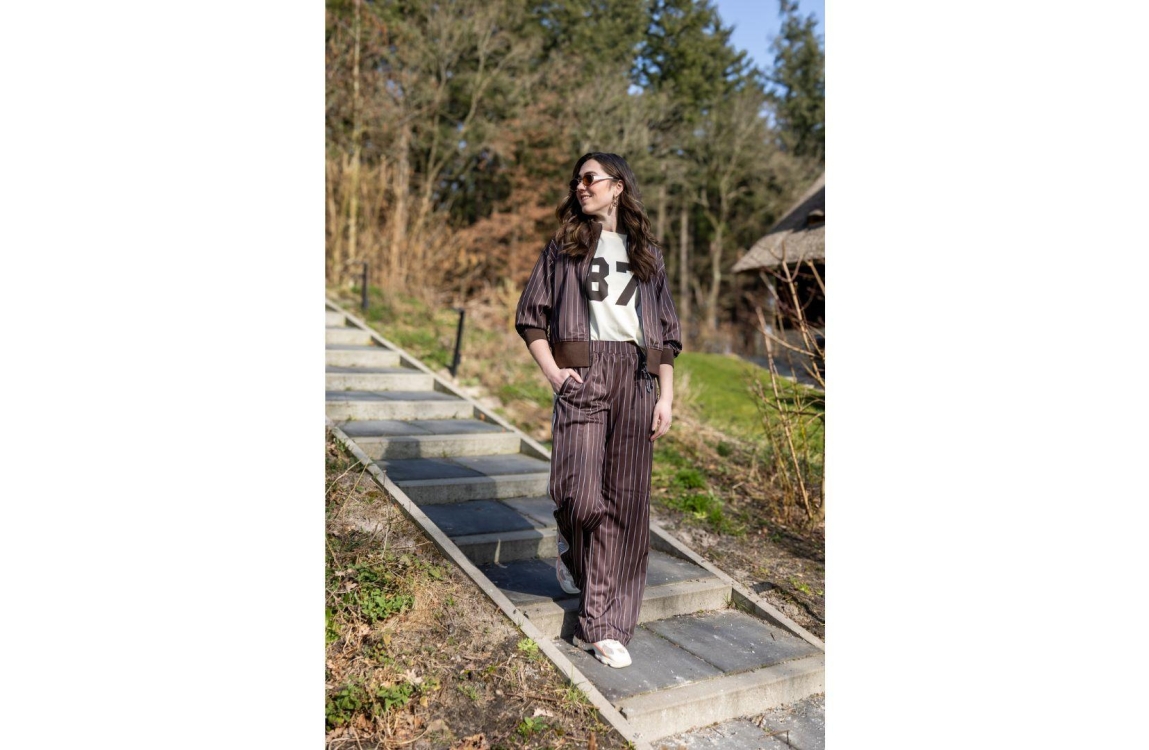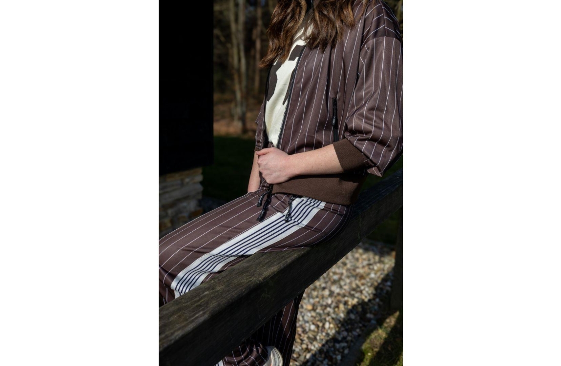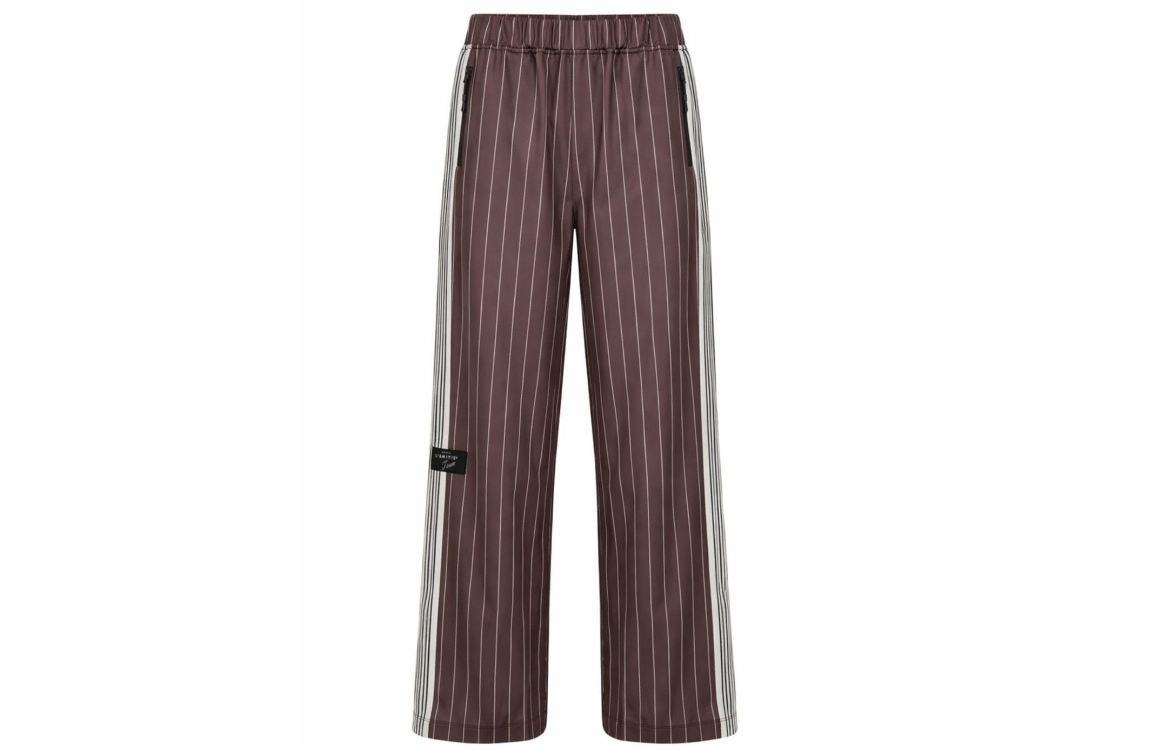 Haute L Amitie Baggy Pin Stripe Track Tall Pants Mocca. Dit straight fit sluit door middel van een elastische boord en beschikt over twee ritszakken aan de voorzijde. Deze bruine sportieve broek is bewerkt met strepen, met het logo en een bies aan de zijkanten.