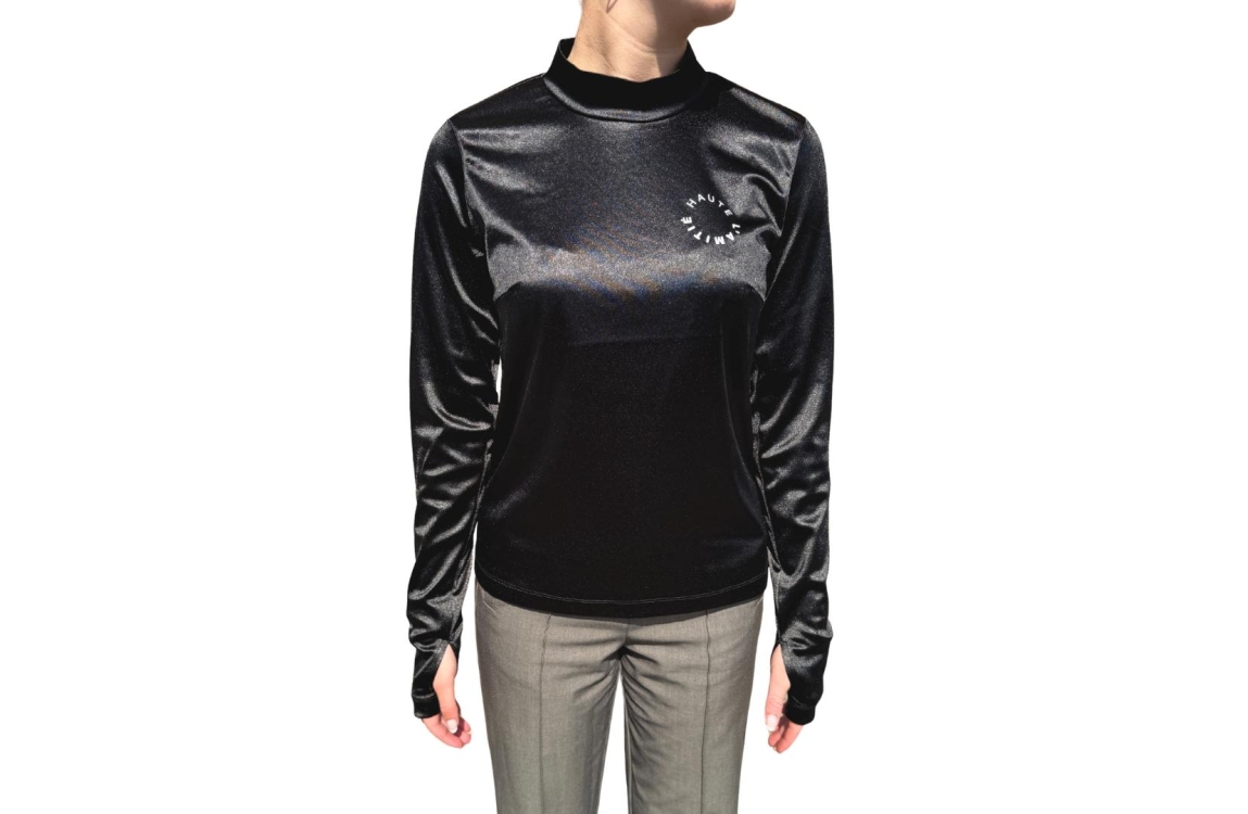 Haute L Amitie shirt HL10281. Dit licht getailleerde model heeft een ronde halslijn en lange mouwen. Deze zwarte shirt van Haute L Amitie is op de linkerborst bewerkt met het merkembleem en is all-over uitgevoerd in een satijnen-look.