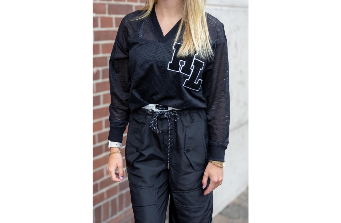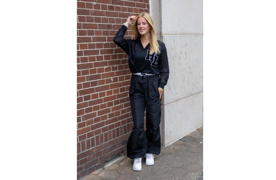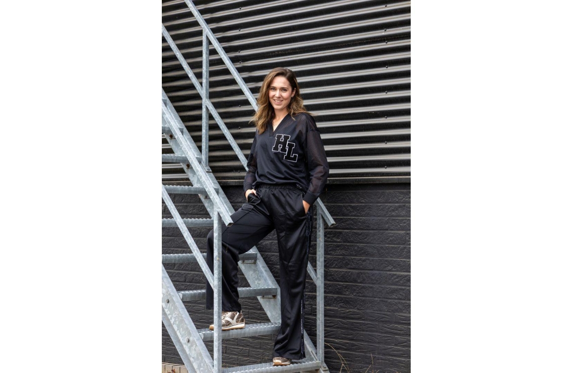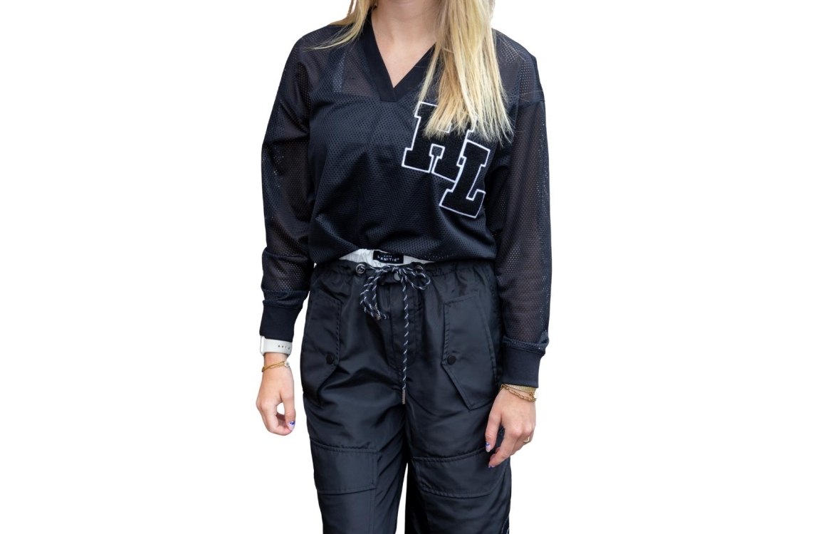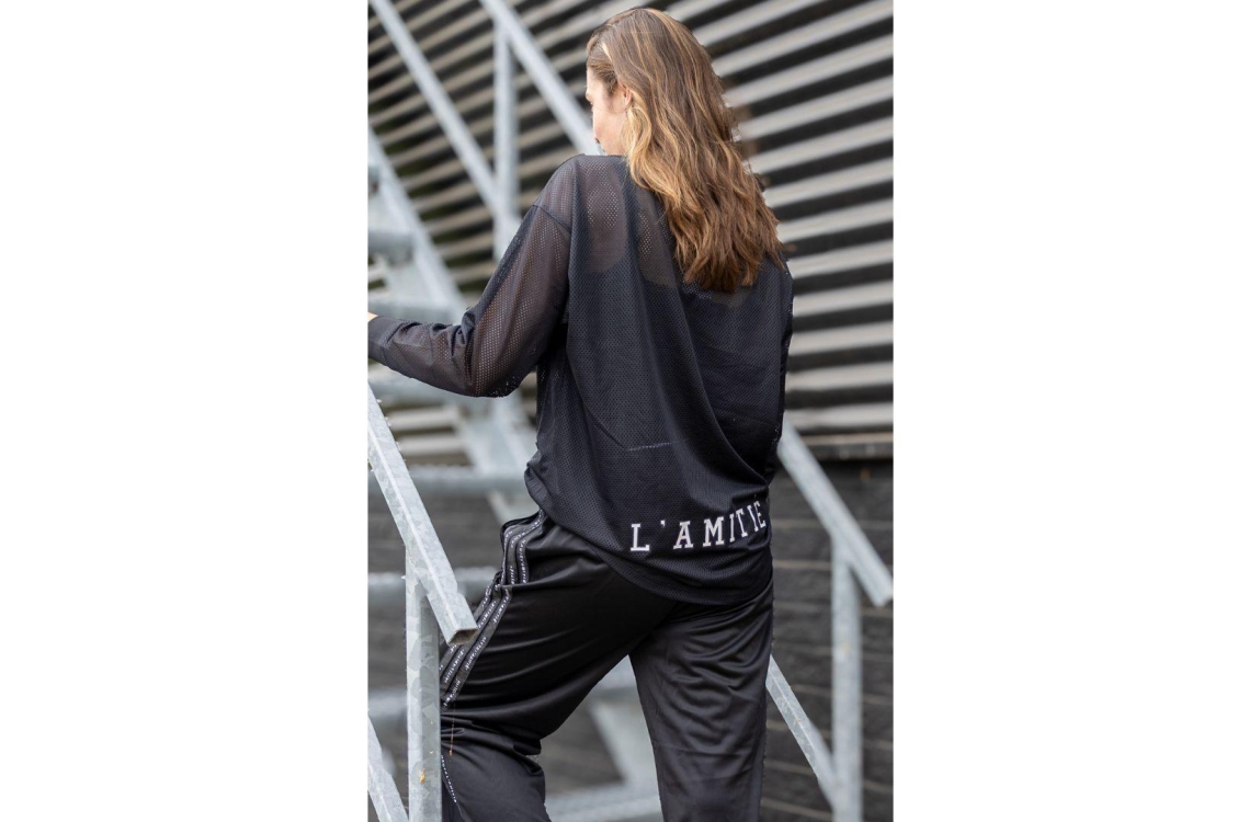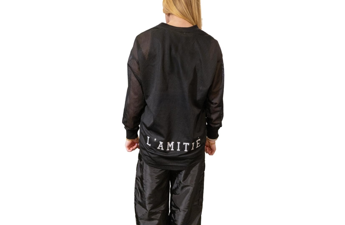 Haute L'Amitié blouse HL10252. Dit wijdvallend model is voorzien van een v-hals en heeft lange mouwen. Deze zwarte blouse van Haute L'Amitié is aan de voorzijde bewerkt met het logo en aan de achter- onderzijde bewerkt met nedrukking. Dit model is uitgevoerd in een mesh kwaliteit en geïnspireerd door American Football.