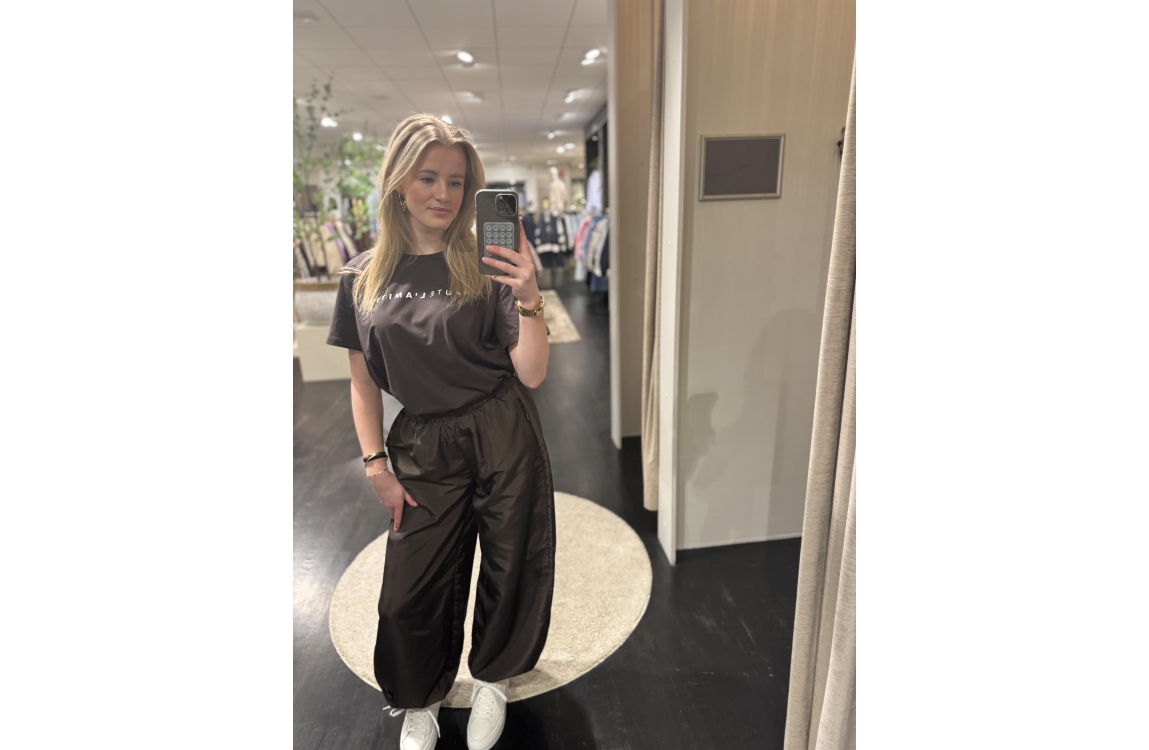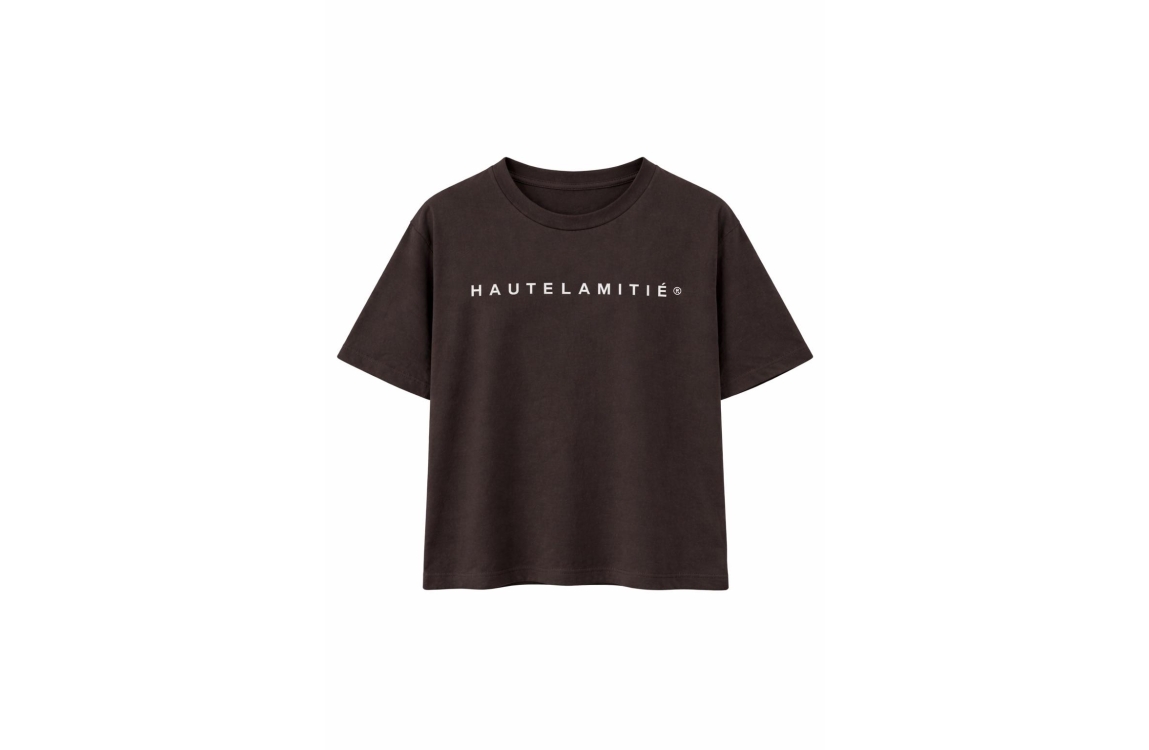 Haute L'Amitié Rub Logo top HL10096. Dit oversized model heeft een ronde hals en korte mouwen. Deze bruine top van Haute L'Amitié is voorzien van een logo op de voorzijde.