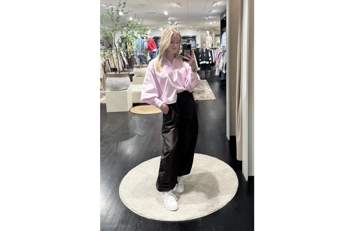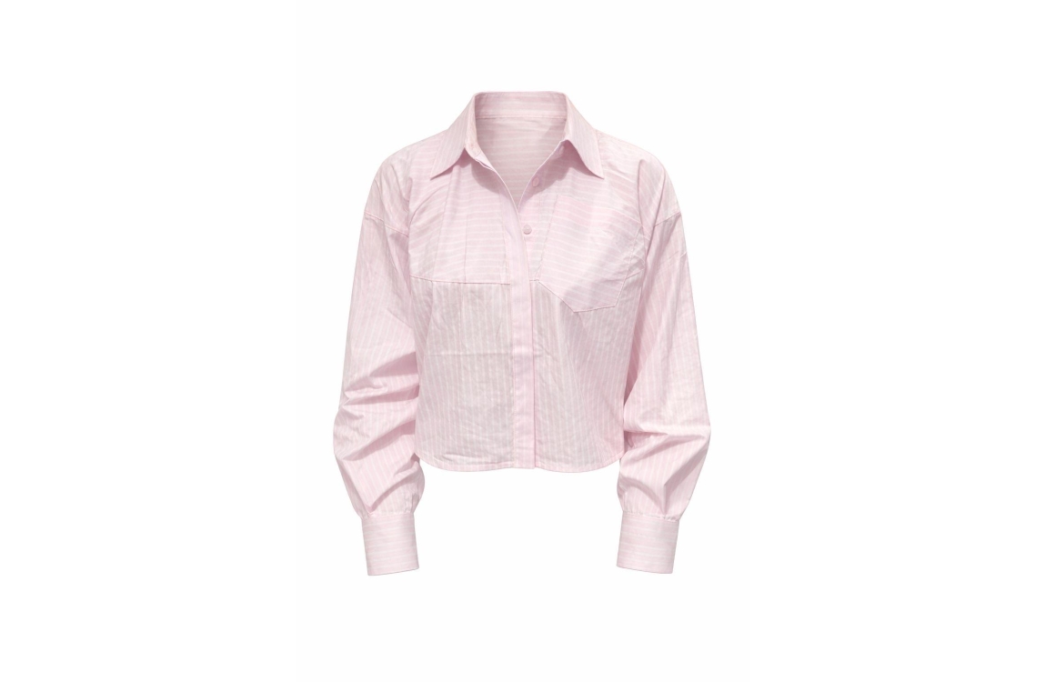 Haute L'Amitié Sophie HL10554. Dit oversized model heeft een kraag, lange mouwen en sluit door middel van knopen. Deze roze blouse van Haute L'Amitié is bewerkt met een logo embleem op de onderzijde van de mouw en een borstzakje. Dit model valt cropped en groot.