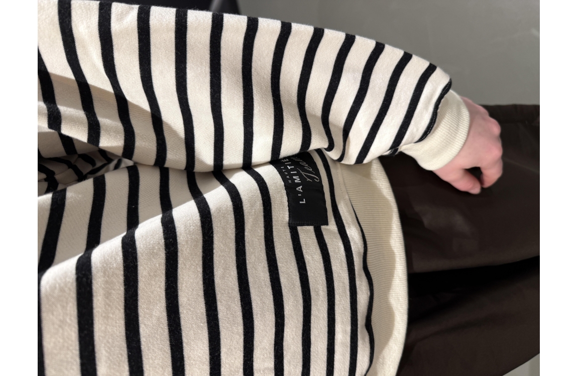 Haute L'Amitié Stripe Application sweater. Dit oversized model heeft een ronde hals en lange mouwen. Deze zwart/wit gestreepte sweater van Haute L'Amitié is bewerkt met een 'HL' logo op de borst een een embleem aan de zijkant.